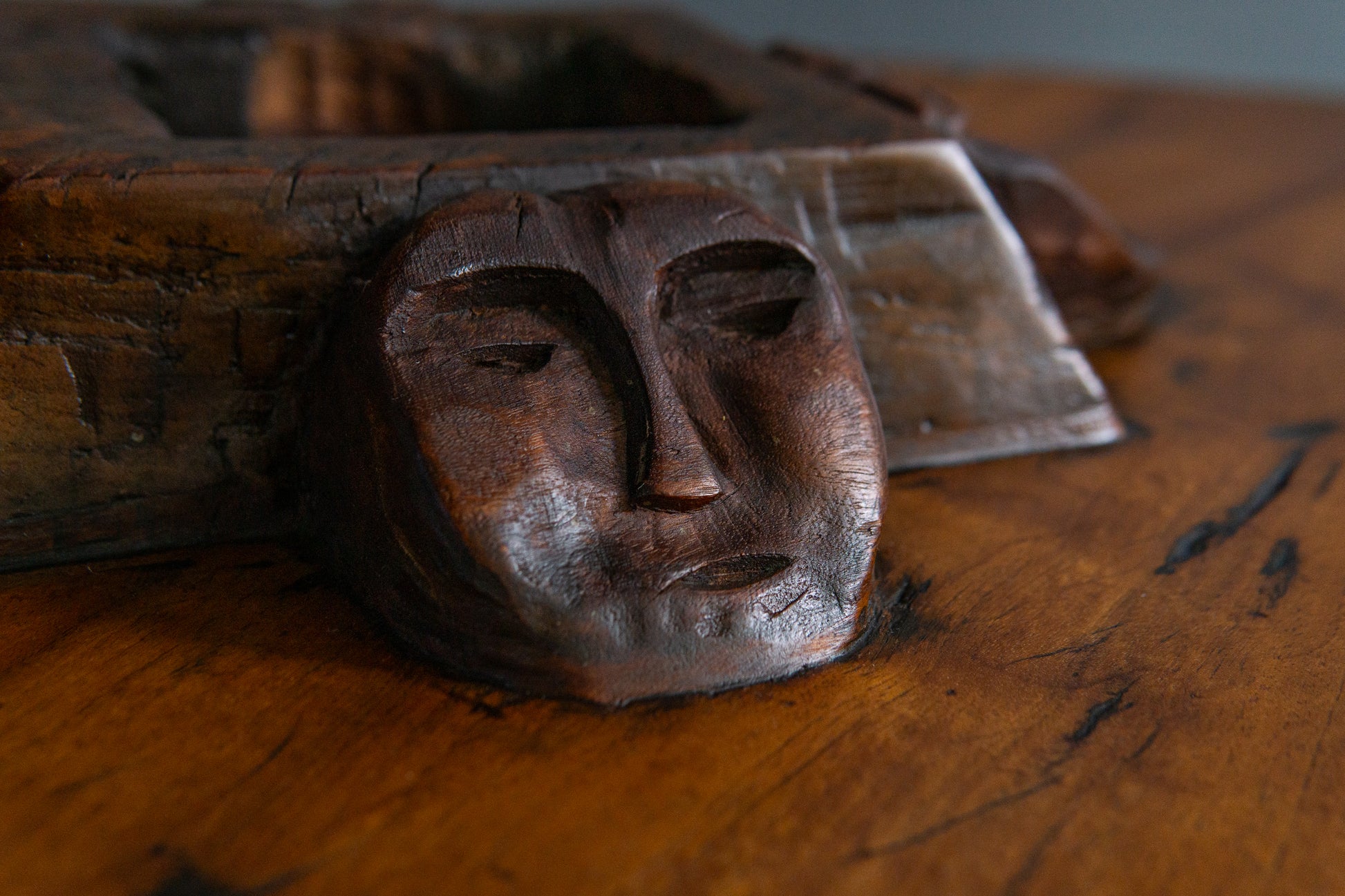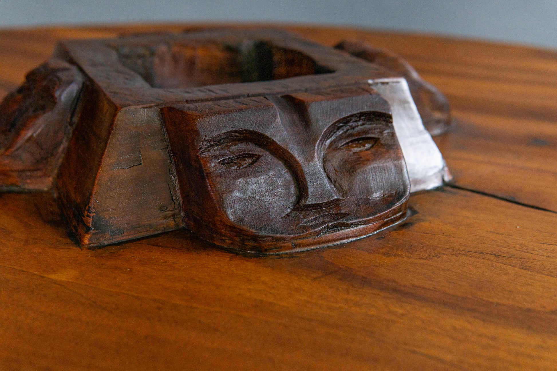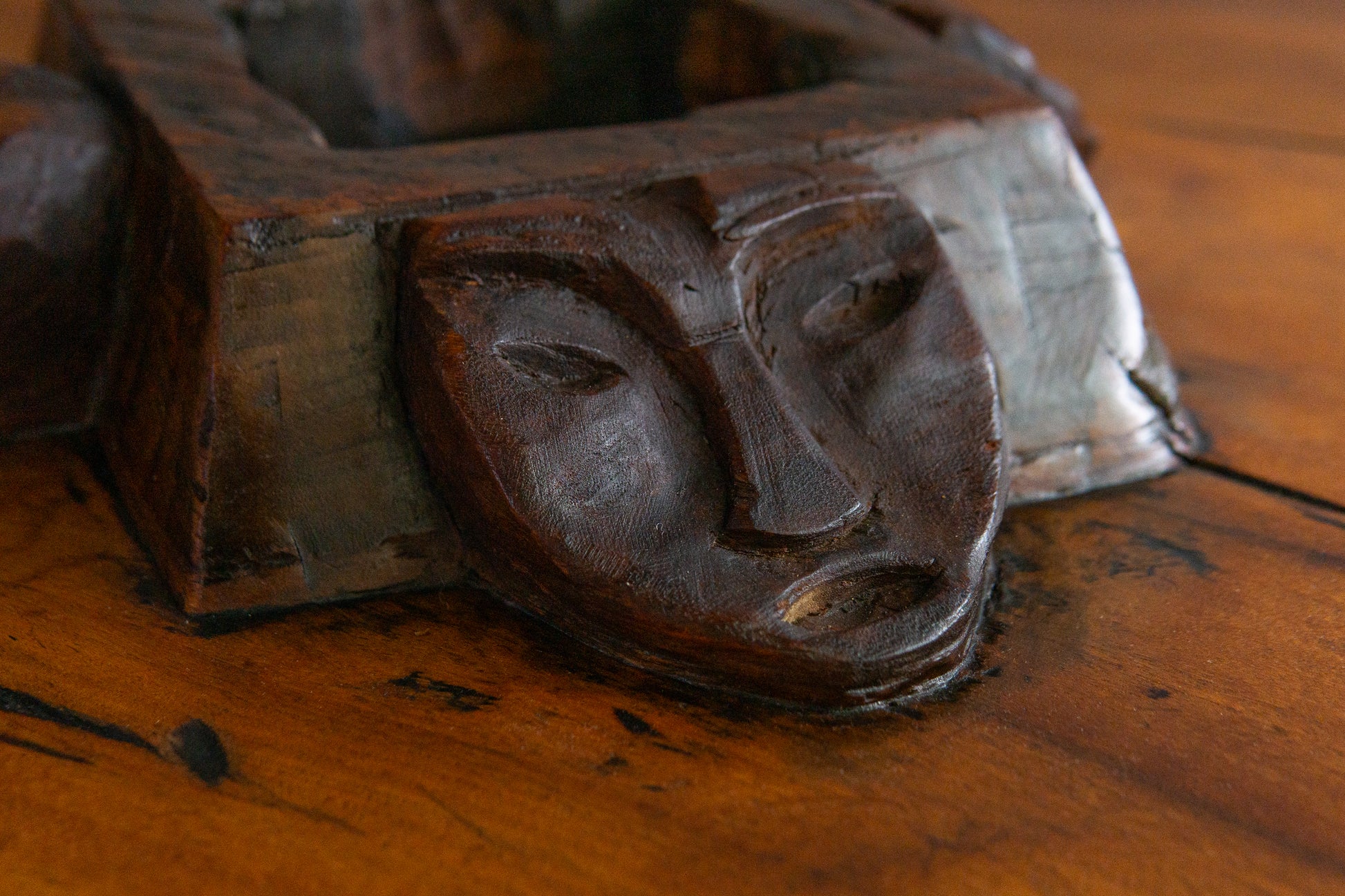 - mittig Ablage mit umlaufend beschnitzten Gesichtern