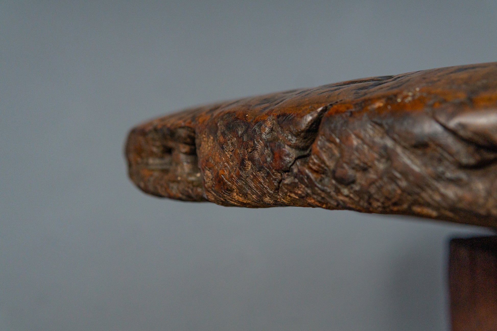 - sehr dicke Deckplatte, seitlich Beschnitzung in Form von Rinde