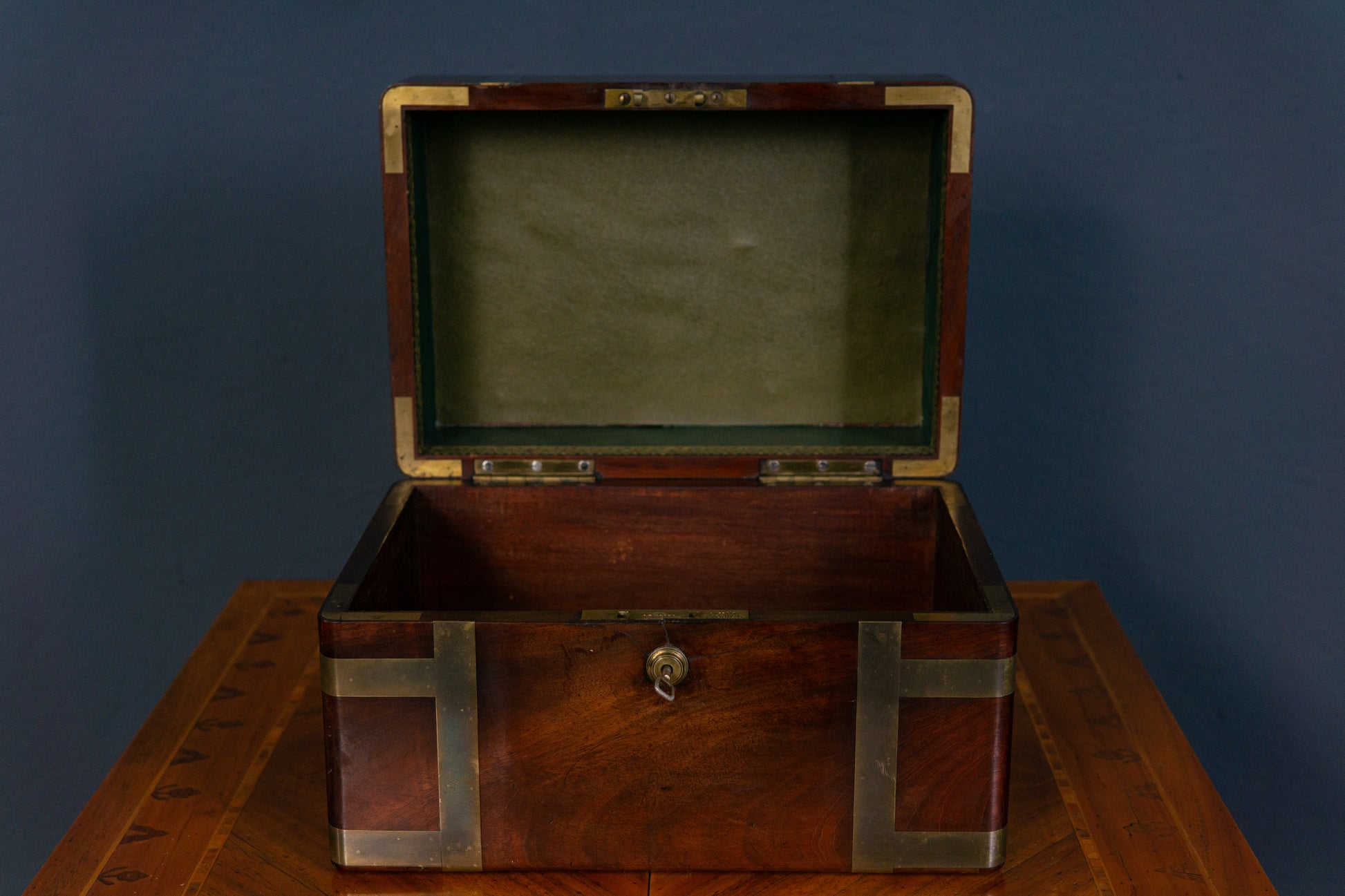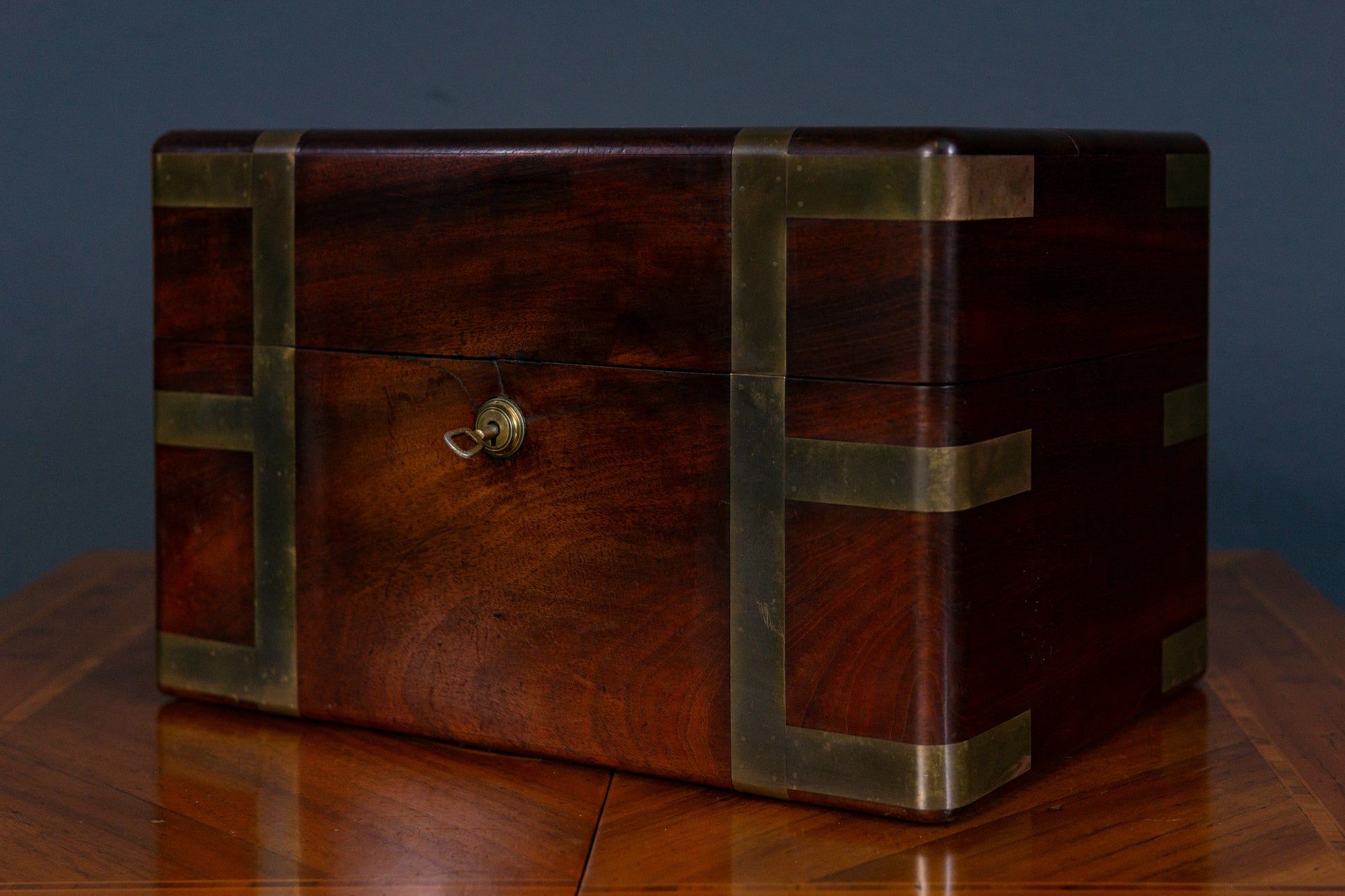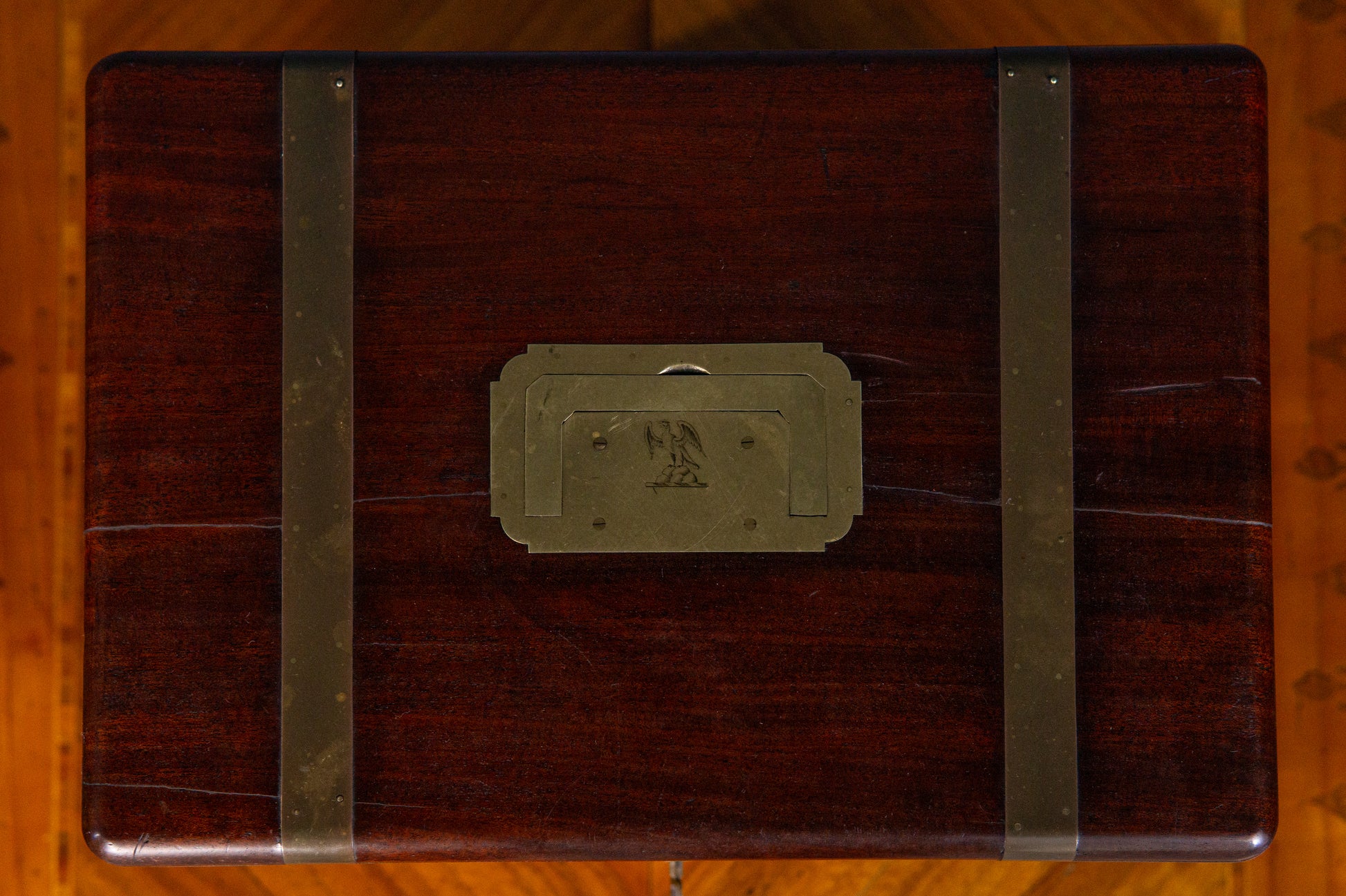 Die Truhe befindet sich in einem guten Zustand mit altersbedingten Gebrauchsspuren.