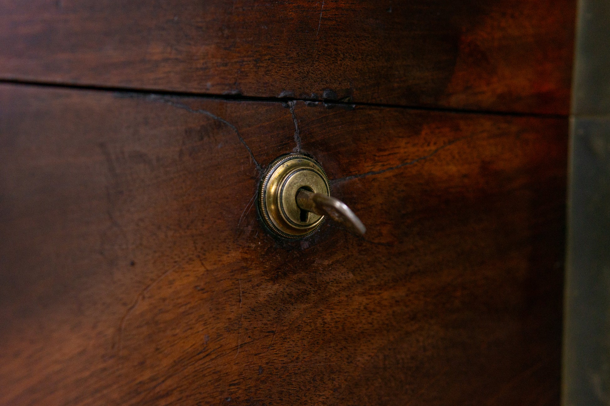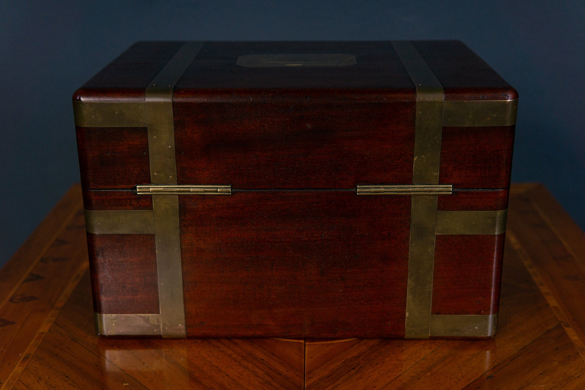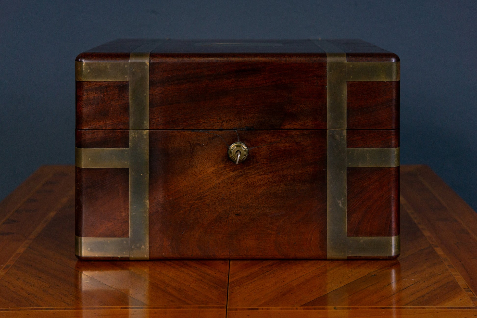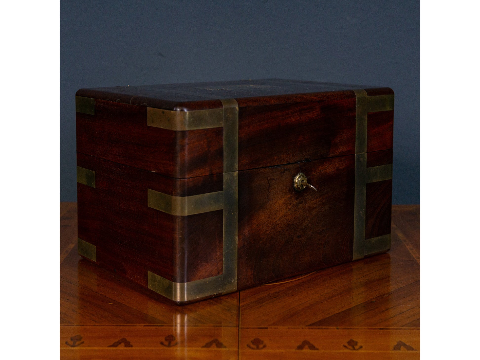 Die Truhe befindet sich in einem guten Zustand mit altersbedingten Gebrauchsspuren.