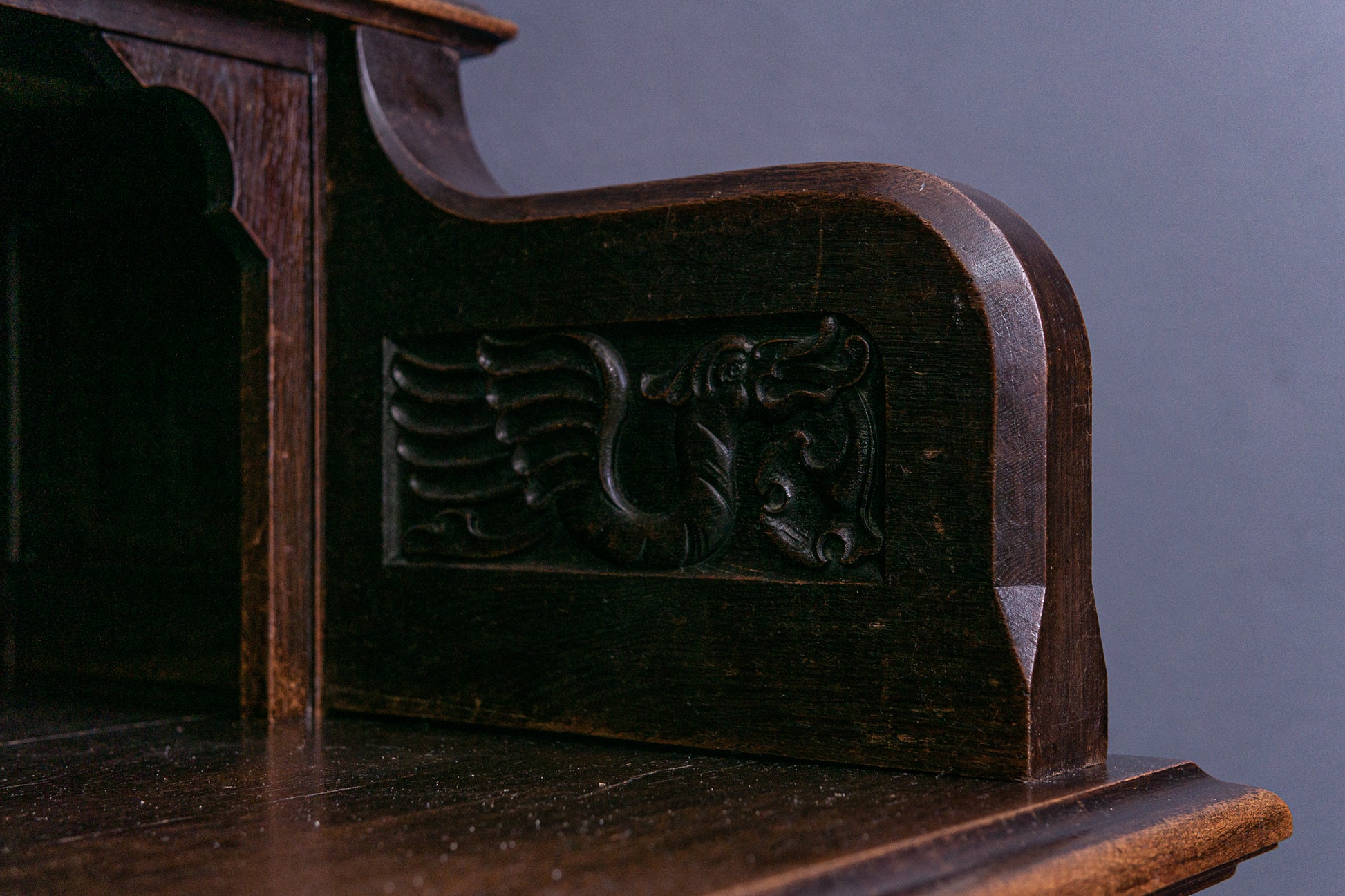 - reiches gotisierendes Schnitzwerk und differenziertes Gotik-Dekor floralisierten Reliefs und Zinnenkranz als Bekrönung