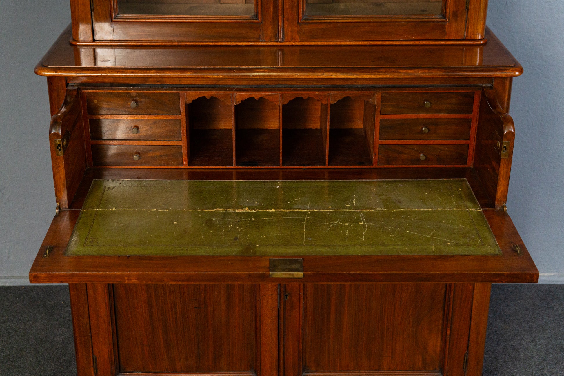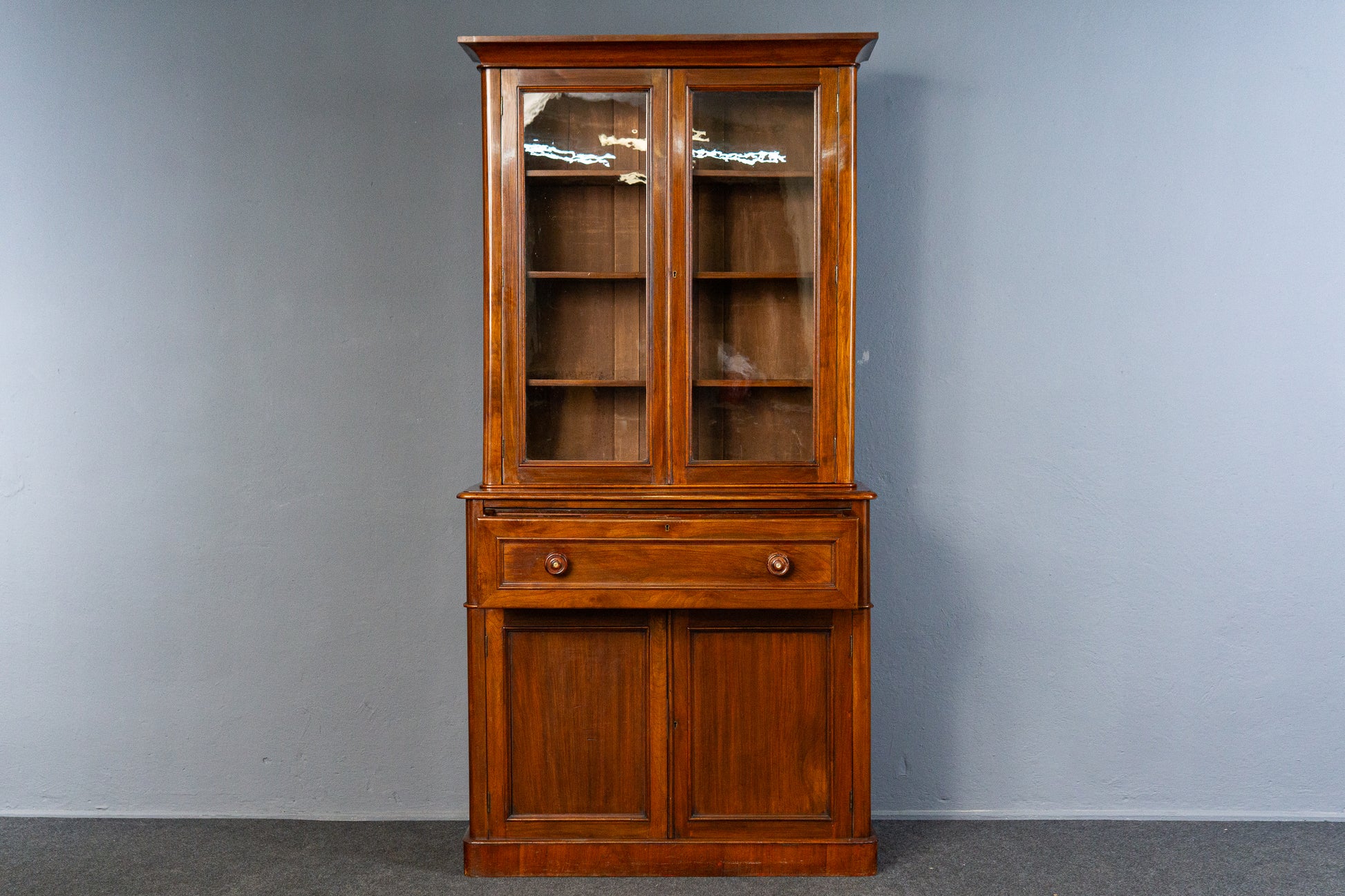 Dieser elegante Bücherschrank mit integriertem Sekretär stammt aus England um 1900 und vereint stilvolle Präsenz mit praktischer Funktionalität. Gefertigt aus massivem Holz mit edlem Mahagonifurnier, besticht das hochwertig gearbeitete Möbel durch seine ausgewogene Formsprache und detailreiche Innenausstattung.