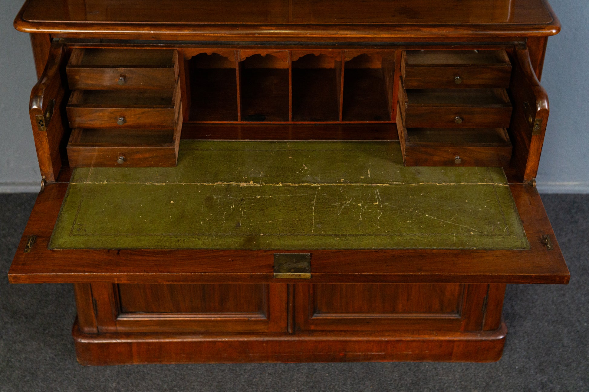 Das Möbel befindet sich in einem guten und funktionsfähigem Zustand mit authentischem Erscheinungsbild und leichten altersbedingten Gebrauchsspuren. Die unteren Türen sind etwas verzogen, lassen sich jedoch schließen. Die Ledereinlage der Schreibfläche hat einen sichtbaren Riss am Klappmechanismus.