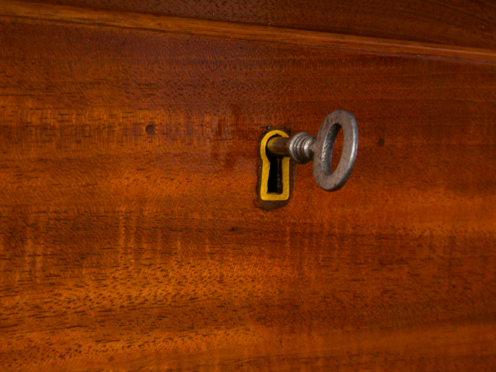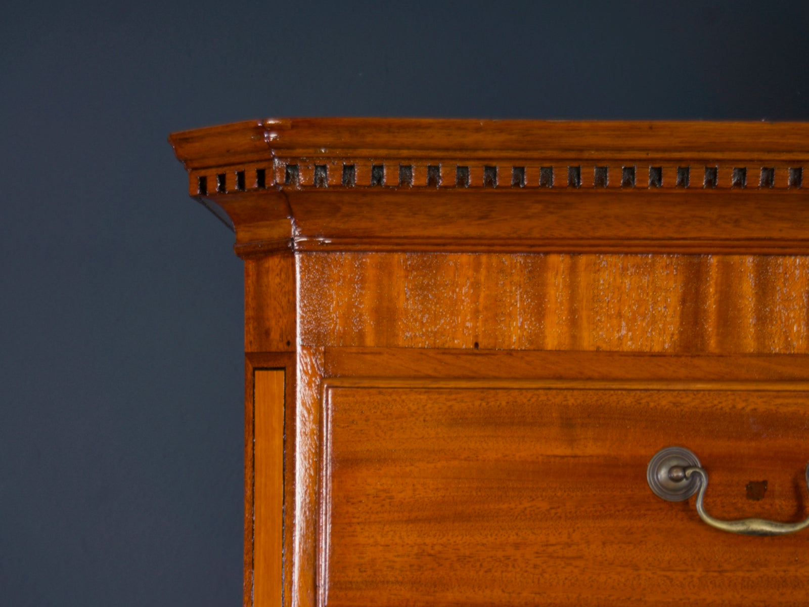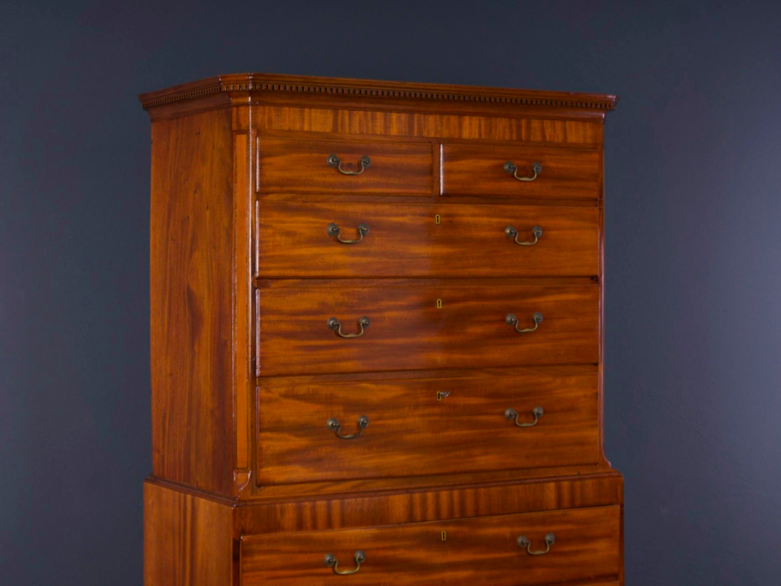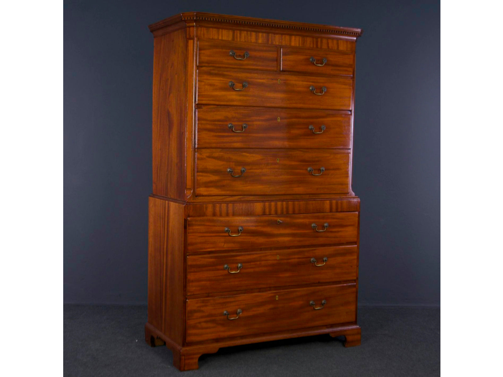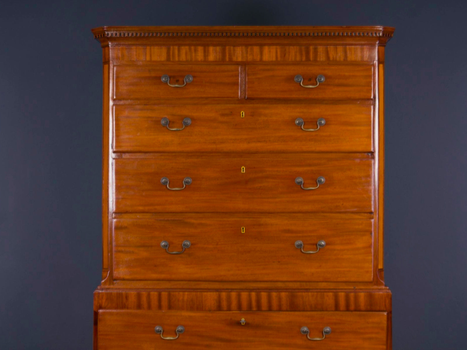 Sehr imposante antike Kommode im viktorianischem Stil aus teilweise massivem Mahagoni, mit einer gradlinigen Front. Die Ecken im oberen Teil der Kommode sind abgeschrägt. Ein umlaufendes, profiliertes Kopfgesims, krönt die Aufsatzkommode über einer wunderschönen hochwertigen Einlegearbeit aus Edelhölzern. Drei große abschließbare Schubladen im, auf Klammerfüßen stehendem, unterem Bereich, sowie drei mittlere Schubladen unter zwei kleinen, nebeneinanderliegenden Schubkästen im Aufsatz geben viel Platz und eine gute Ordnungsstruktur. Die originalen Beschläge und Schlüssel zusammen mit der tollen Oberfläche geben der Aufsatzkommode ein herrschaftliches und doch gleichzeitig zurückhaltendes Aussehen.
