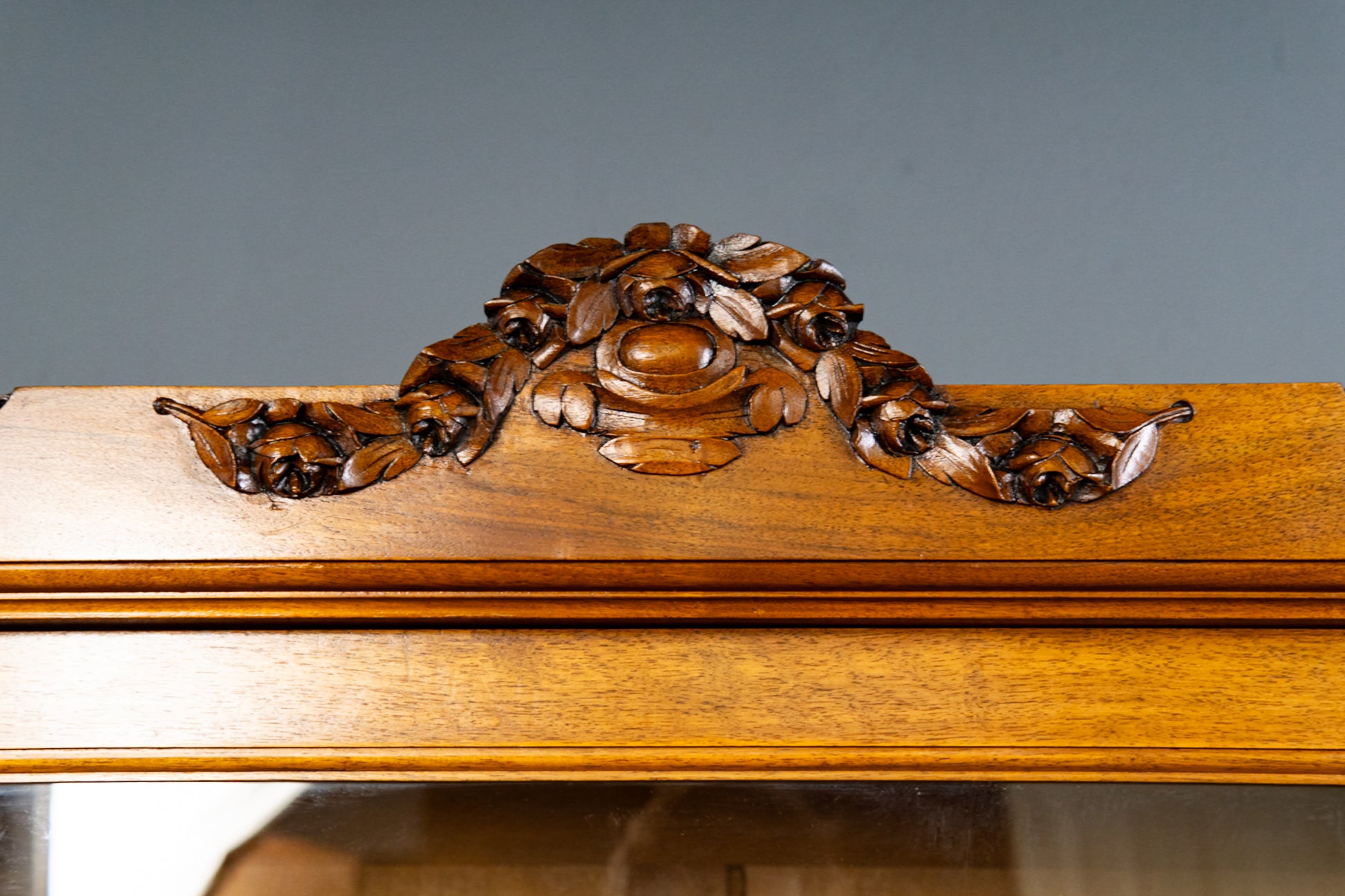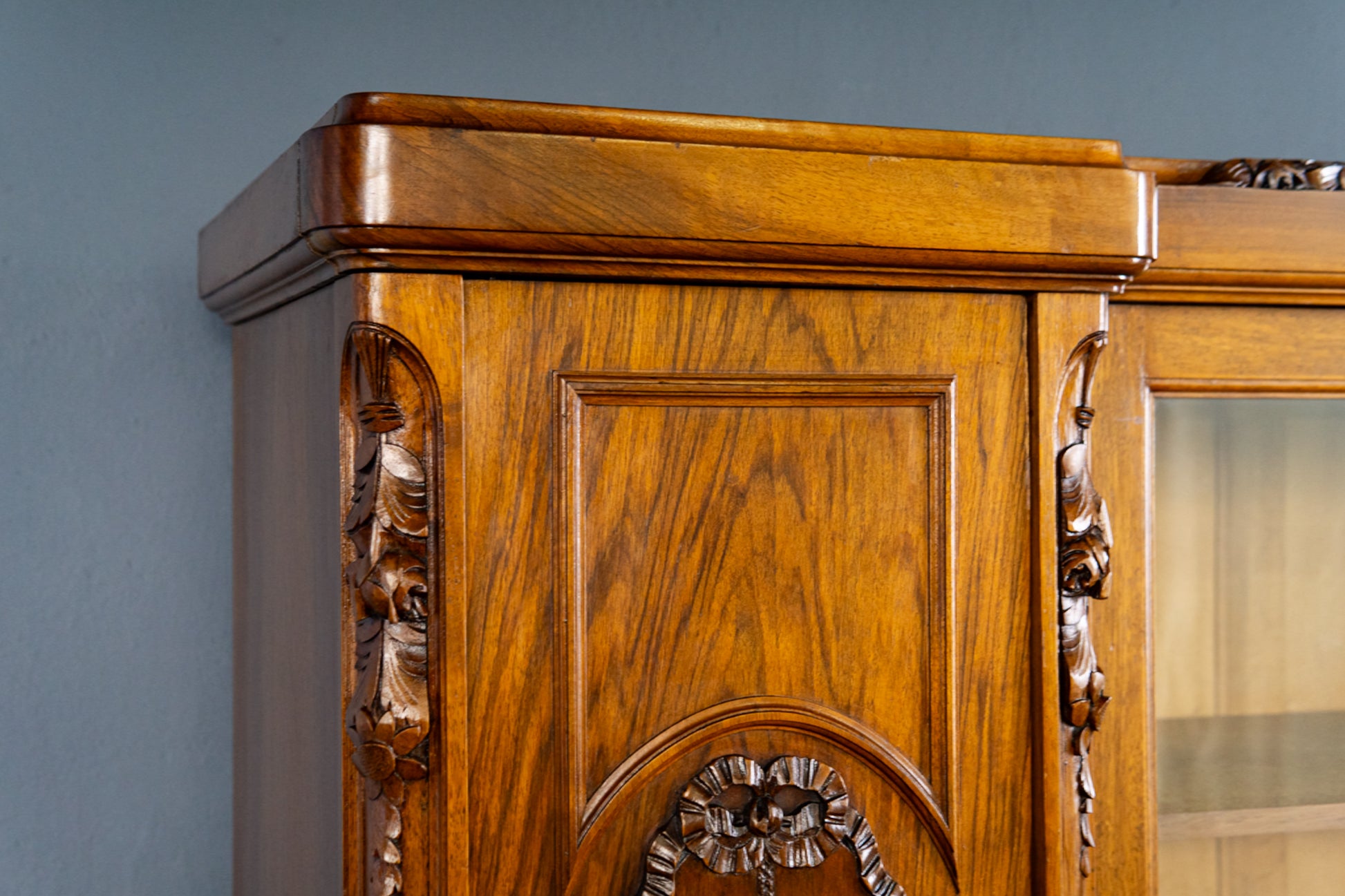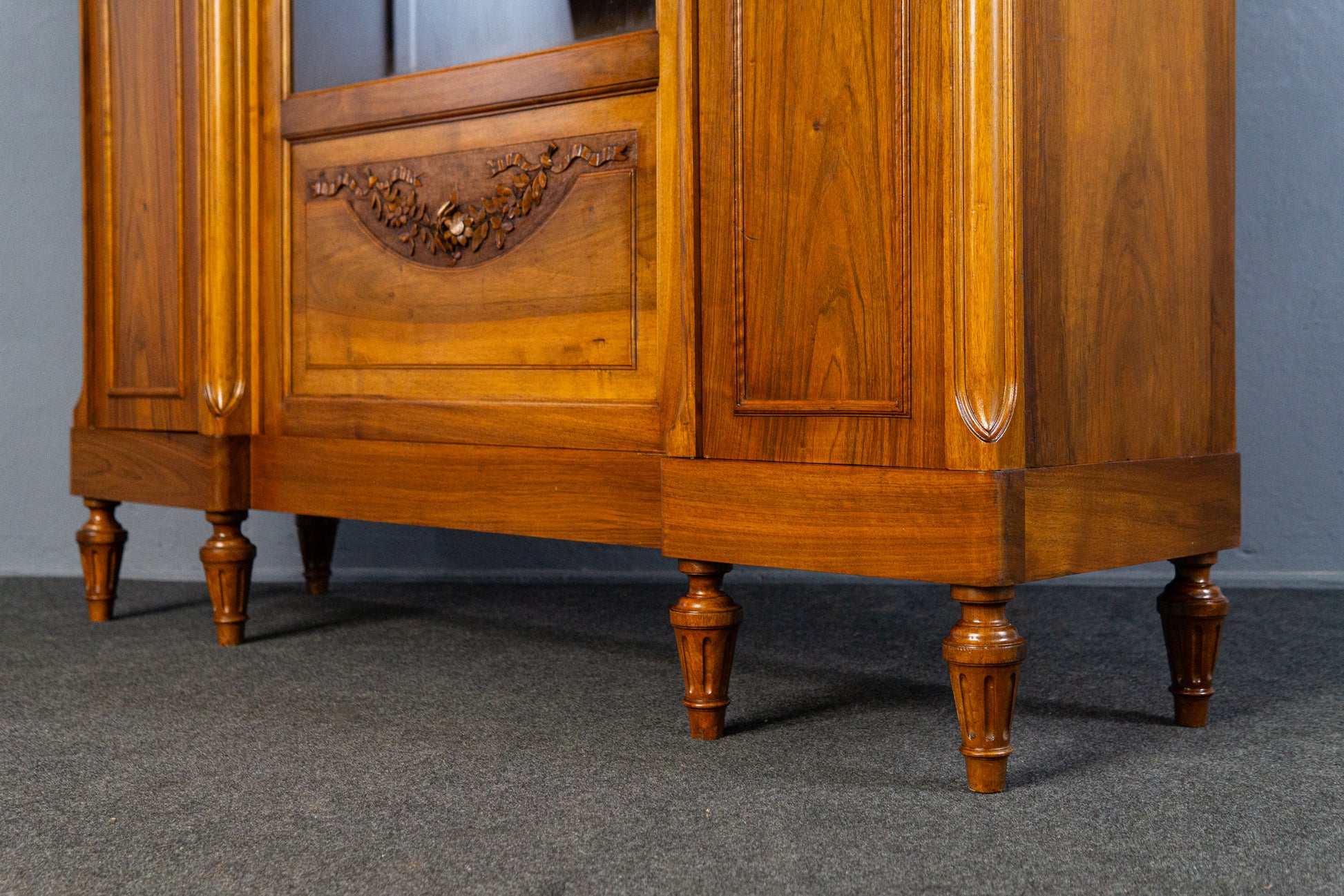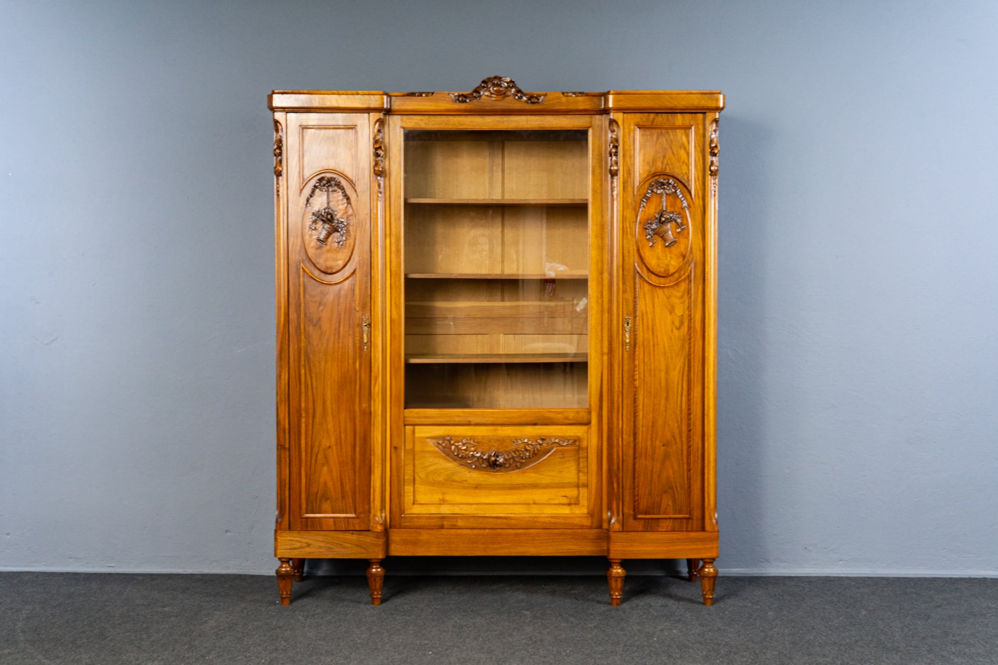 französischer Jugendstil Bücherschrank, Anfang des 20.Jahrhunderts - Nussbaum Eiche dreitürig Schnitzereien Schrank Vitrine Alt Antik MÖBLINGER