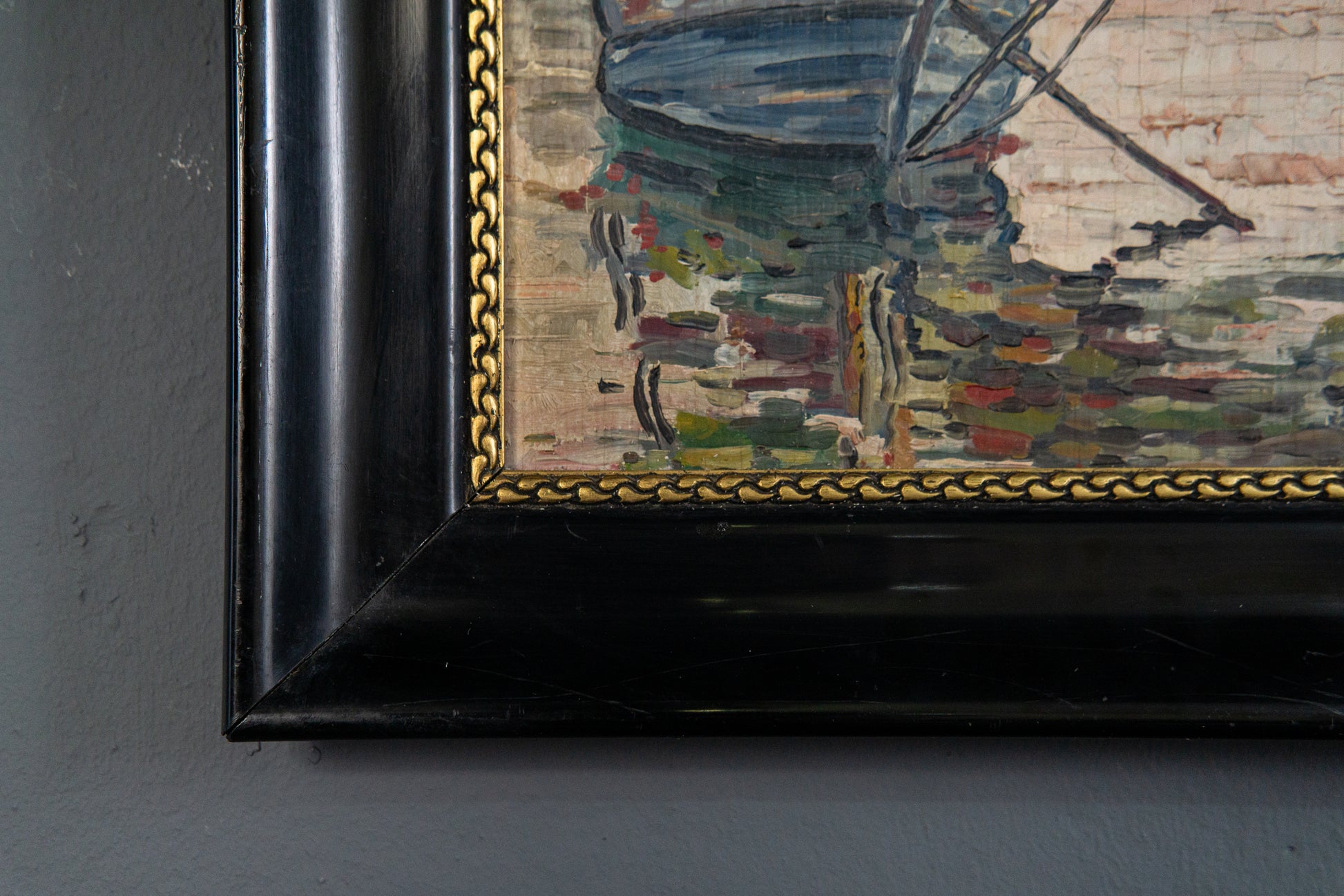 - Ölbild auf furnierter Holzplatte mit schwarzem Profilrahmen