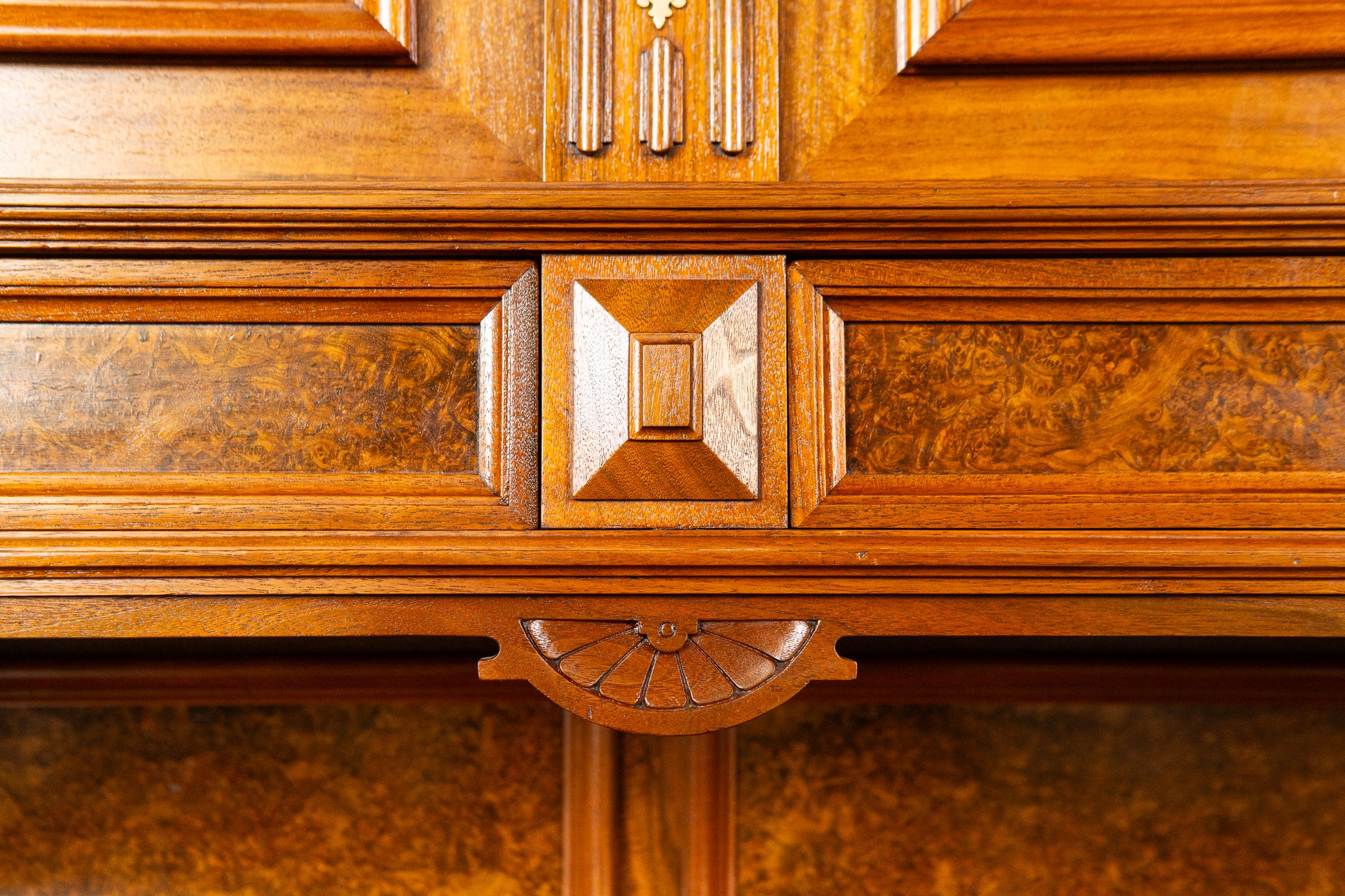 - Kopfteil mit profiliertem Gesims, Aufdoppelungen in Nussbaum sowie stiltypische Applikationen