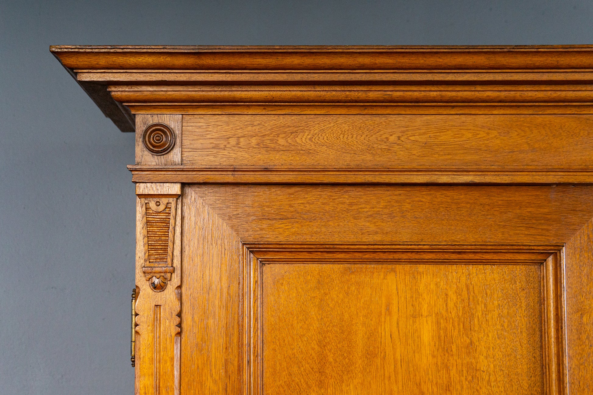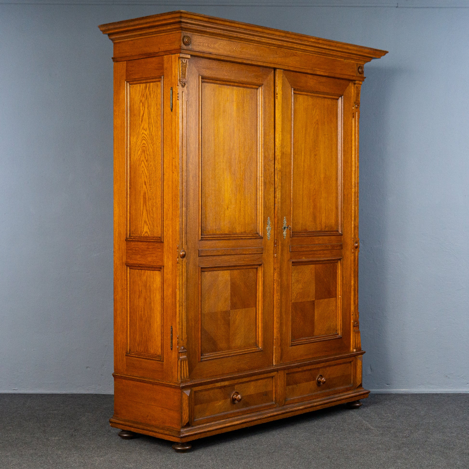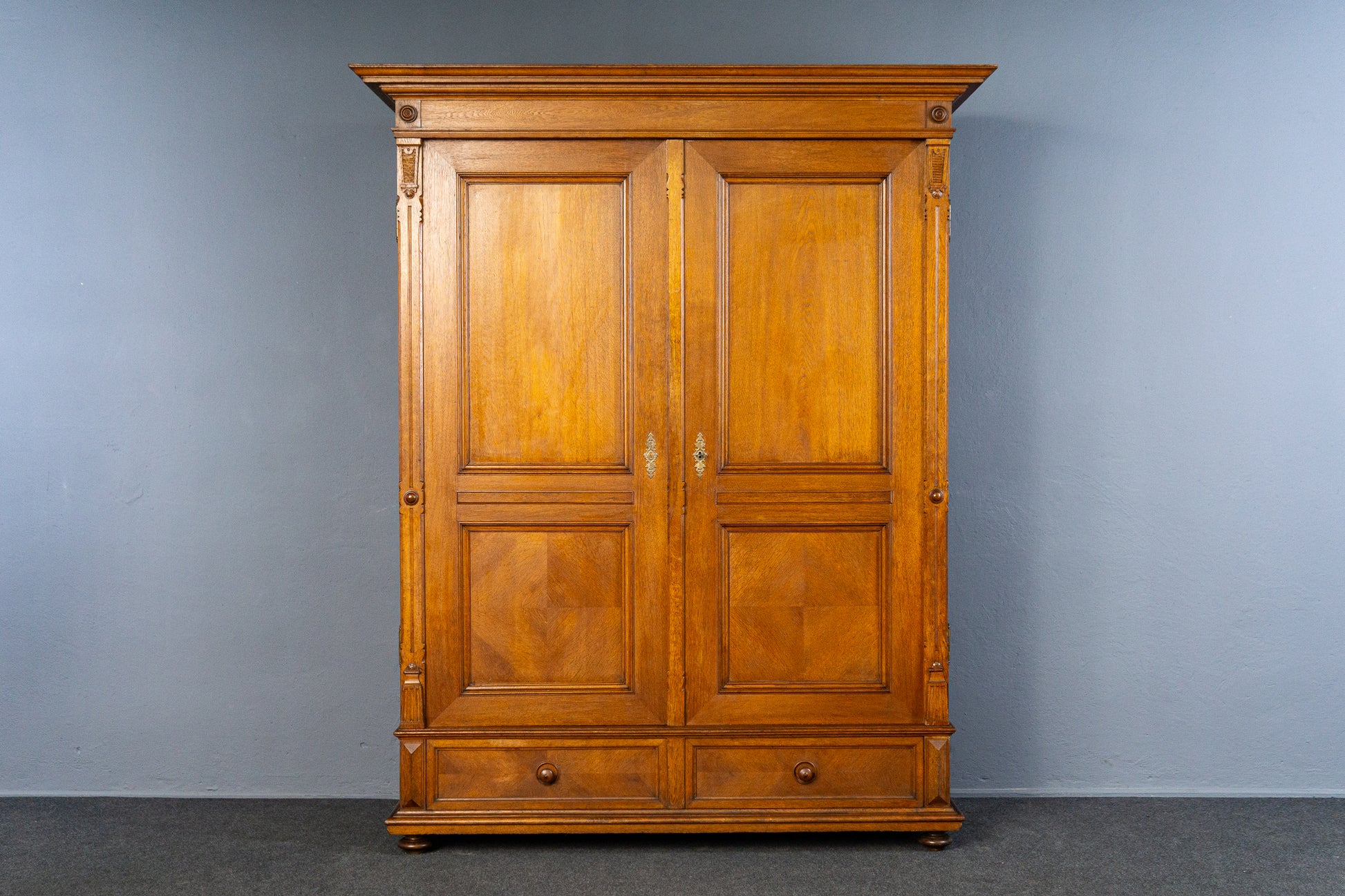 Dieser elegante Wäscheschrank aus der zweiten Hälfte des 19. Jahrhunderts stammt aus der Gründerzeit und überzeugt durch seine harmonische Formsprache und hochwertige Verarbeitung. Gefertigt in einer Vollholzkonstruktion mit Eichefurnier und teilweise massiven Elementen, bietet das Möbelstück zwei höhenverstellbare Fachböden (weitere auf Wunsch erhältlich) sowie einen breiten, leichtgängigen Schubkasten im Sockel – original auf Rollen und Metallschienen gelagert. Messingbeschläge, ein funktionierendes Schloss mit Schlüssel und die Möglichkeit zur kompletten Zerlegung für den Transport unterstreichen den praktischen und nachhaltigen Charakter dieses gut erhaltenen, authentischen Möbels.