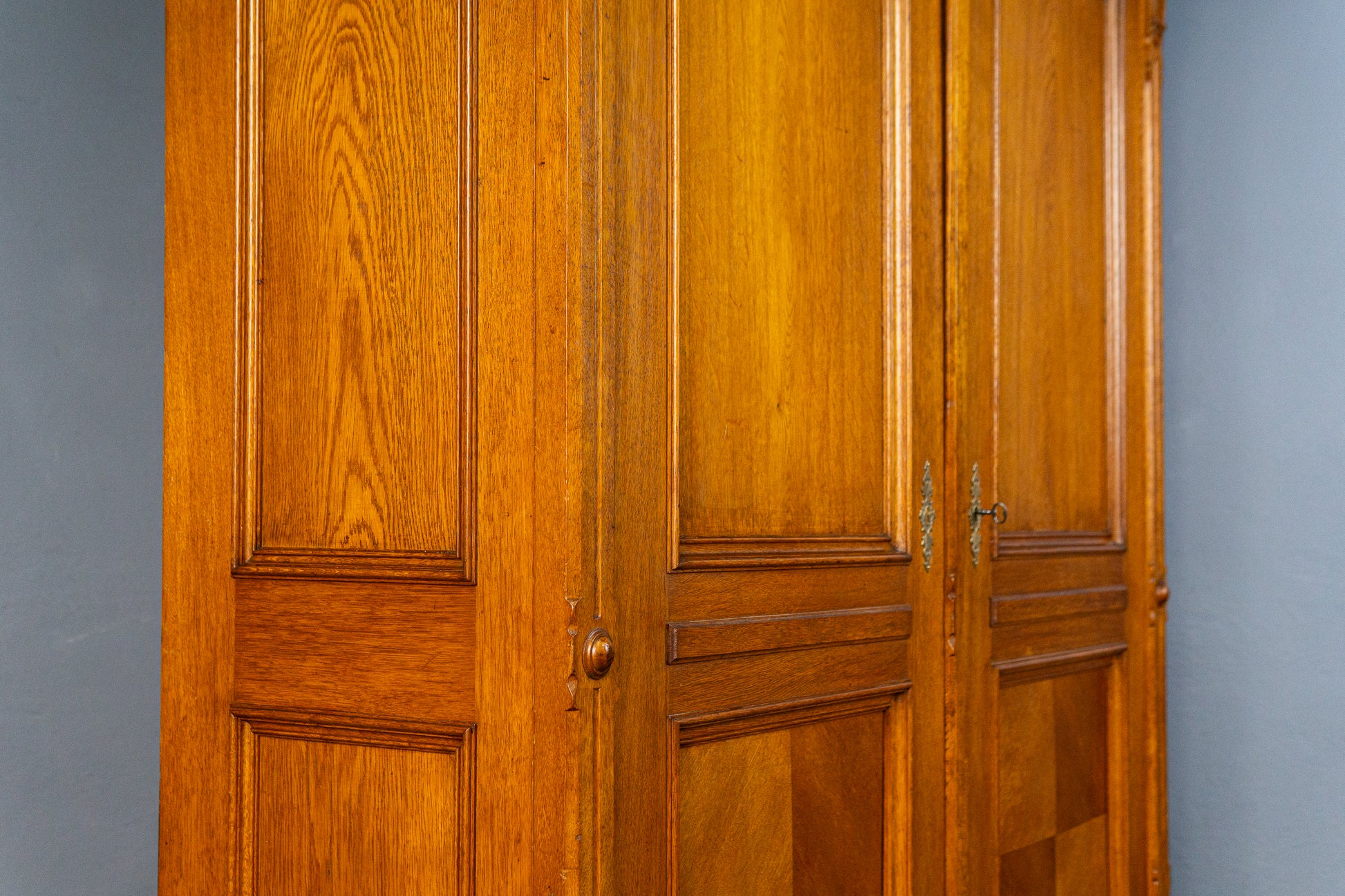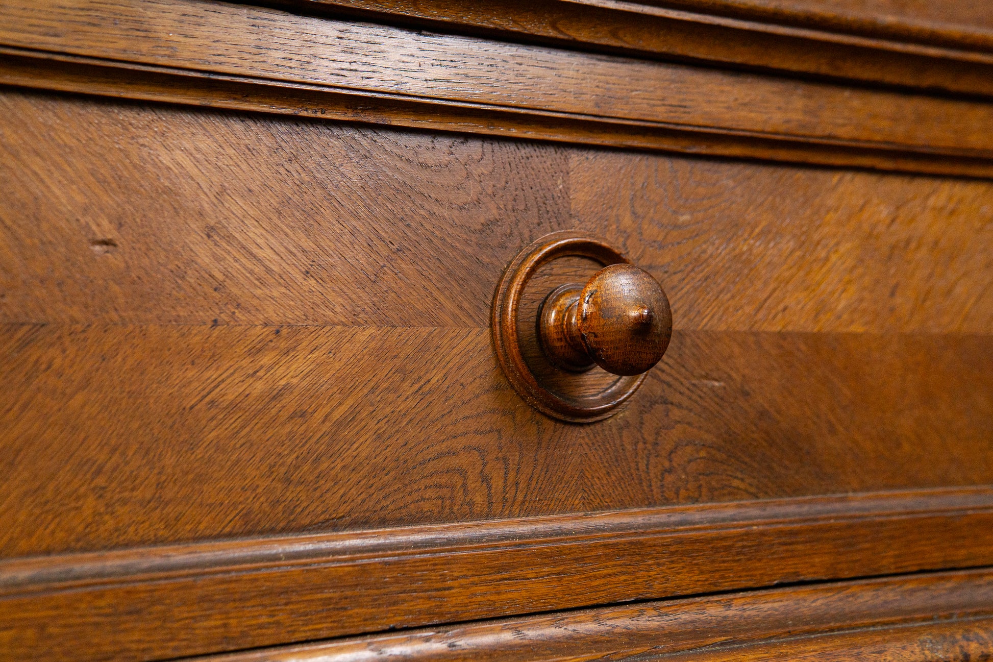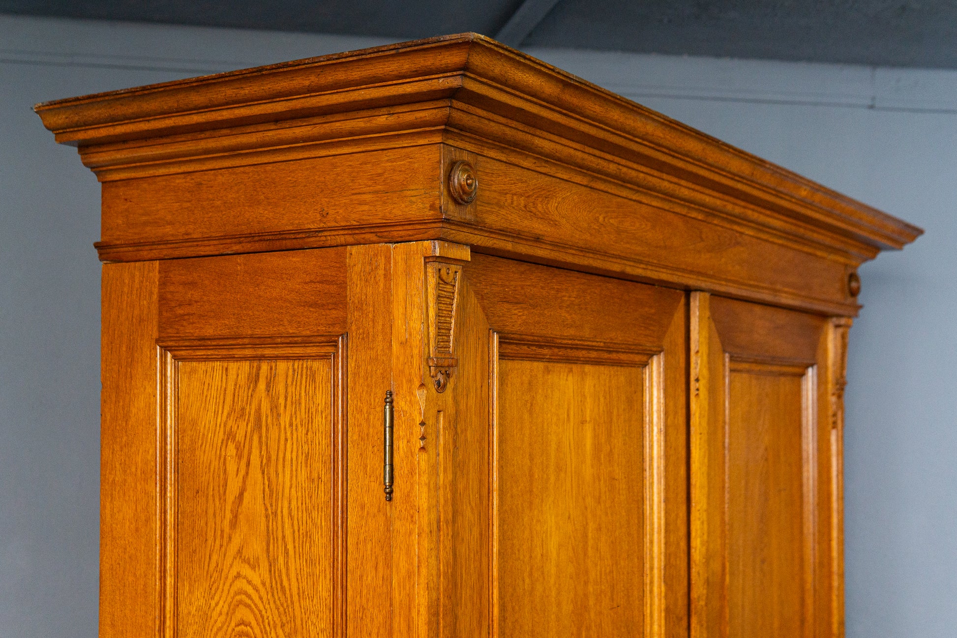 Dieser elegante Wäscheschrank aus der zweiten Hälfte des 19. Jahrhunderts stammt aus der Gründerzeit und überzeugt durch seine harmonische Formsprache und hochwertige Verarbeitung. Gefertigt in einer Vollholzkonstruktion mit Eichefurnier und teilweise massiven Elementen, bietet das Möbelstück zwei höhenverstellbare Fachböden (weitere auf Wunsch erhältlich) sowie einen breiten, leichtgängigen Schubkasten im Sockel – original auf Rollen und Metallschienen gelagert. Messingbeschläge, ein funktionierendes Schloss mit Schlüssel und die Möglichkeit zur kompletten Zerlegung für den Transport unterstreichen den praktischen und nachhaltigen Charakter dieses gut erhaltenen, authentischen Möbels.