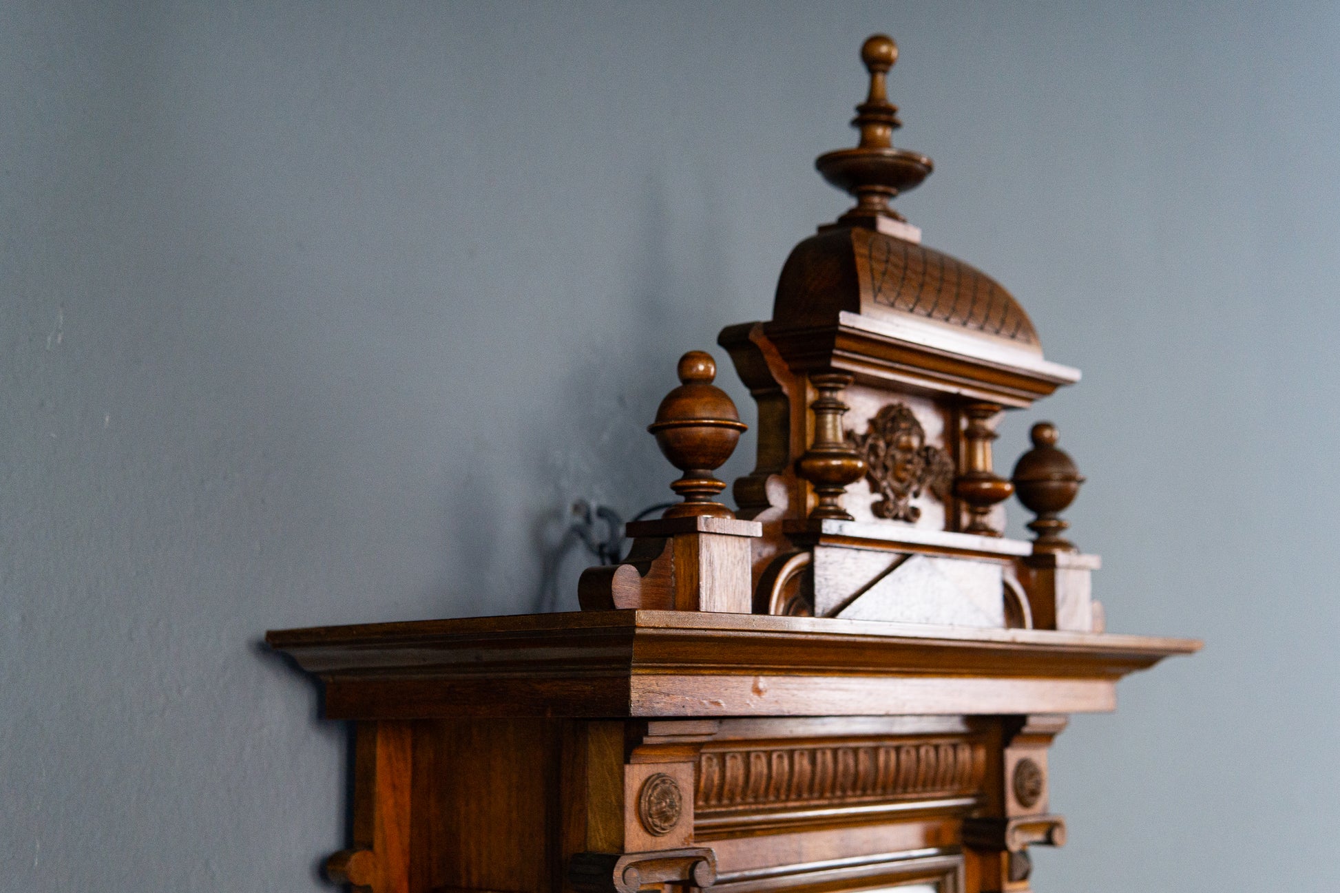 - verziert mit aufwendiger Bekrönung, Schnitzereien sowie Drechselelementen