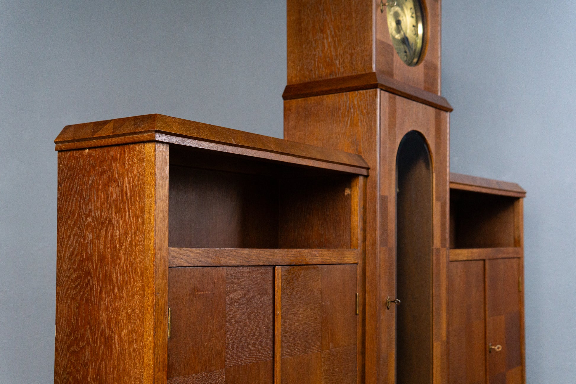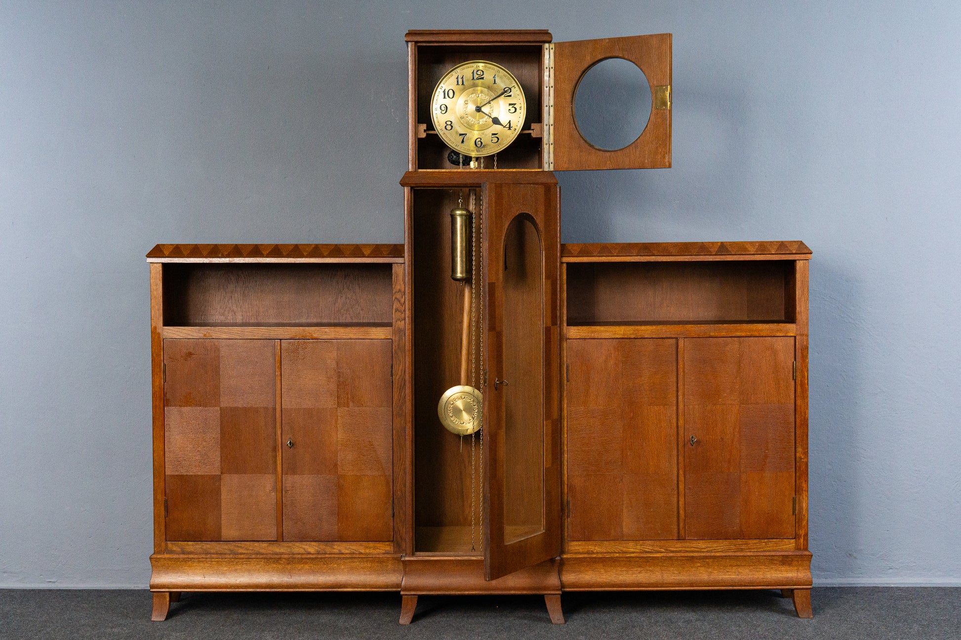 Dieses außergewöhnliche Möbelstück aus der Jugendstilzeit um 1910 vereint die Funktionen eines Bücherschranks mit dem repräsentativen Charakter einer Standuhr – ein seltener Fund für Liebhaber antiker Einrichtung. Gefertigt in Eiche furnierter Vollholzkonstruktion, überzeugt der Schrank durch seine elegante Formsprache und solide Handwerksqualität. Der Innenausbau bietet höhenverstellbare Fachböden, hochwertige Messingbeschläge, vier Schlüssel sowie Schubstangenschlösser. Das Möbel ist in drei Teile zerlegbar und somit gut transportierbar. Es befindet sich in einem authentischen, altersgemäßen Zustand mit Gebrauchsspuren; das Uhrwerk ist aktuell ohne Funktion und sollte fachgerecht überprüft werden. Ein besonderes, nachhaltiges Originalstück mit Seltenheitswert.