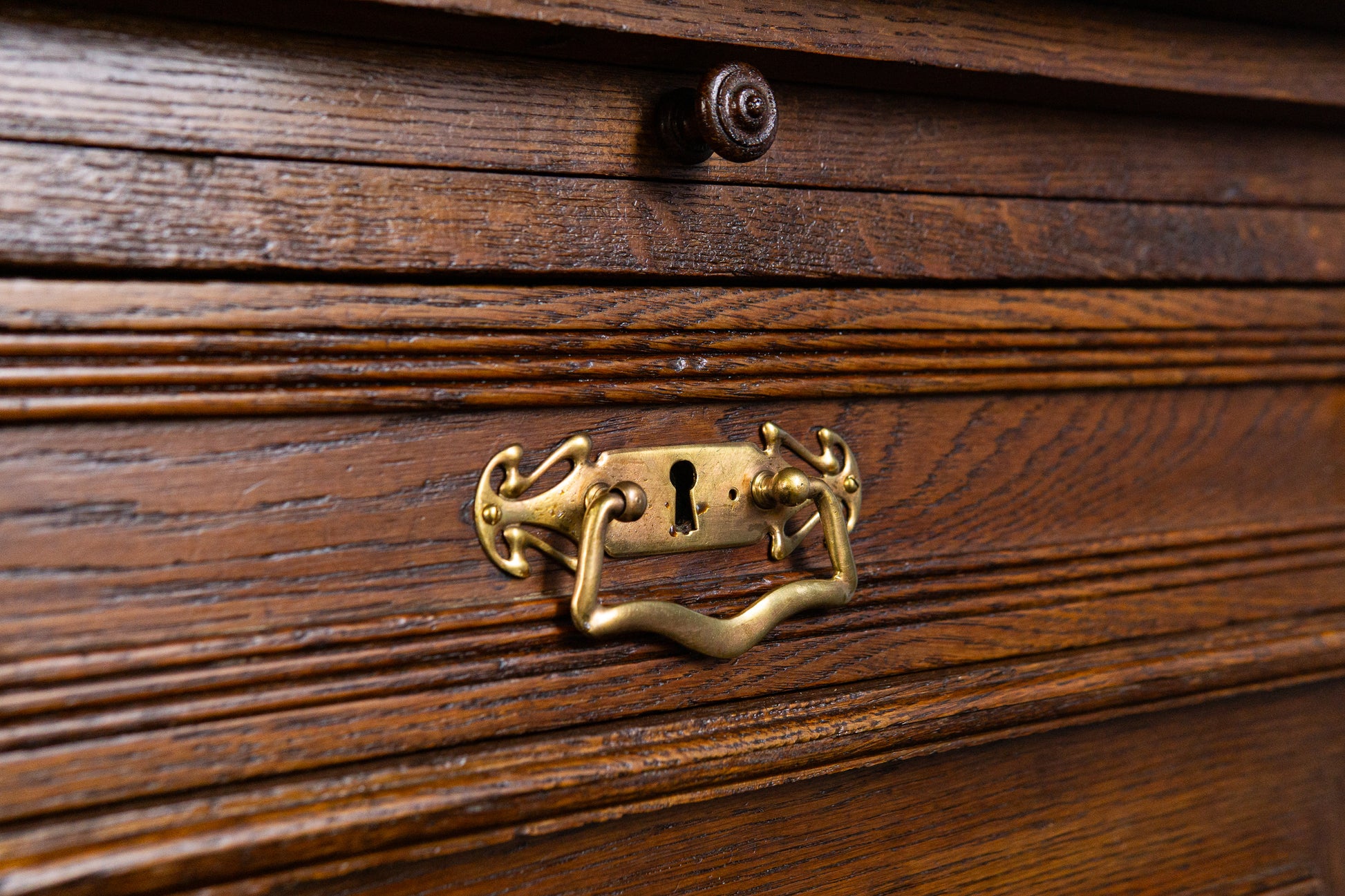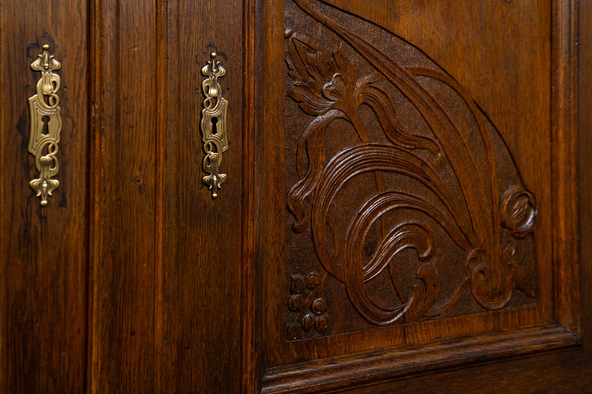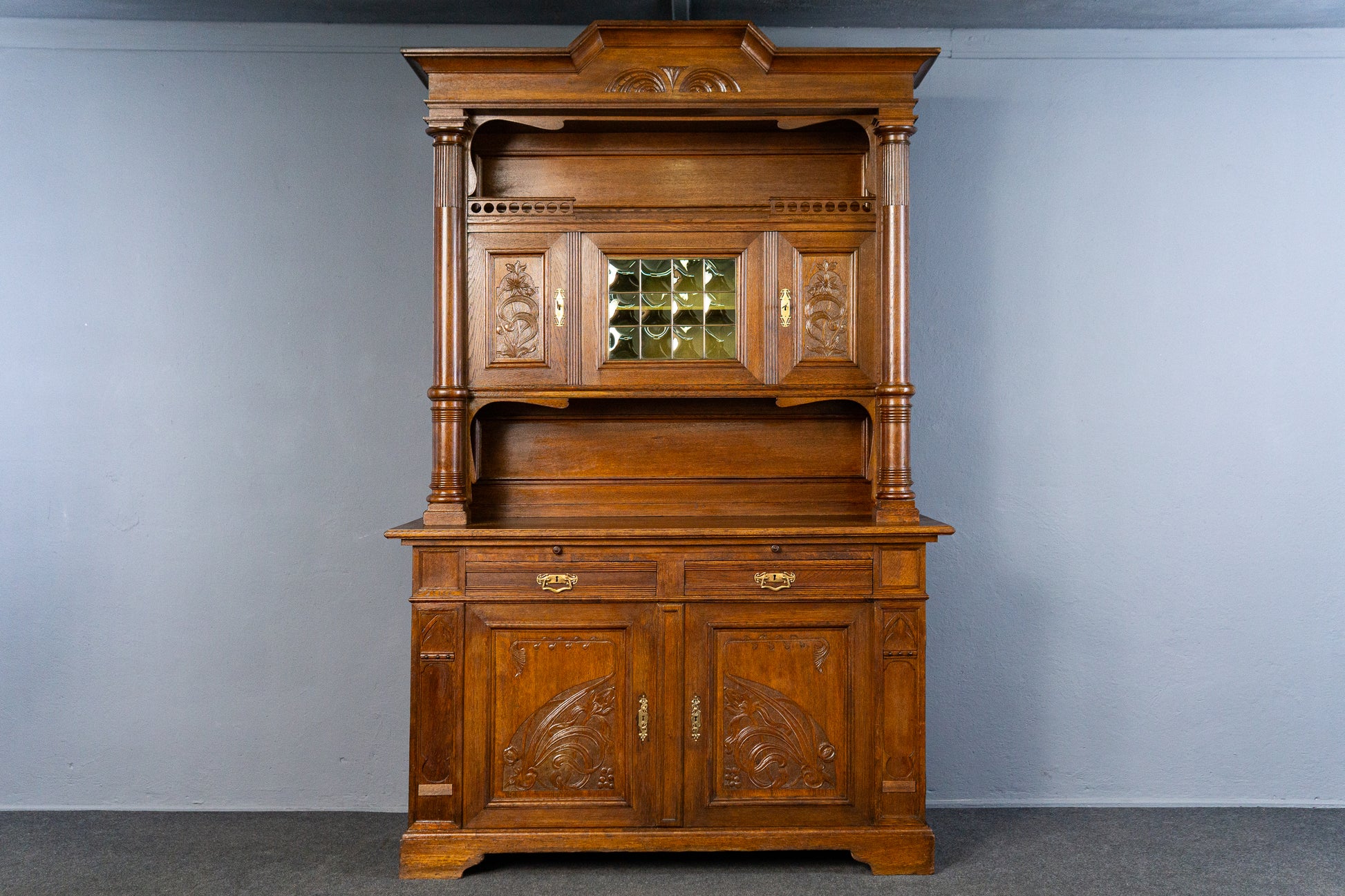 Dieses dekorative Aufsatzbuffet aus der Jugendstilzeit um 1900 vereint ästhetische Eleganz mit praktischer Funktionalität. Gefertigt in Vollholzkonstruktion mit Eichefurnier und teils massiven Elementen, überzeugt es durch detailreiche Handwerkskunst und durchdachten Innenausbau: Fachböden im Ober- und Unterteil, leichtlaufende Schubkästen sowie eine herausziehbare Ablage bieten großzügigen Stauraum. Originale Messingbeschläge, drei abschließbare Türen mit Schlüsseln sowie die Möglichkeit zur Zerlegung in zwei Teile machen dieses Buffet zu einem stilvollen und zugleich alltagstauglichen Möbelstück. In gutem, authentischem Zustand – ein langlebiges, nachhaltiges Original aus dem frühen 20. Jahrhundert.