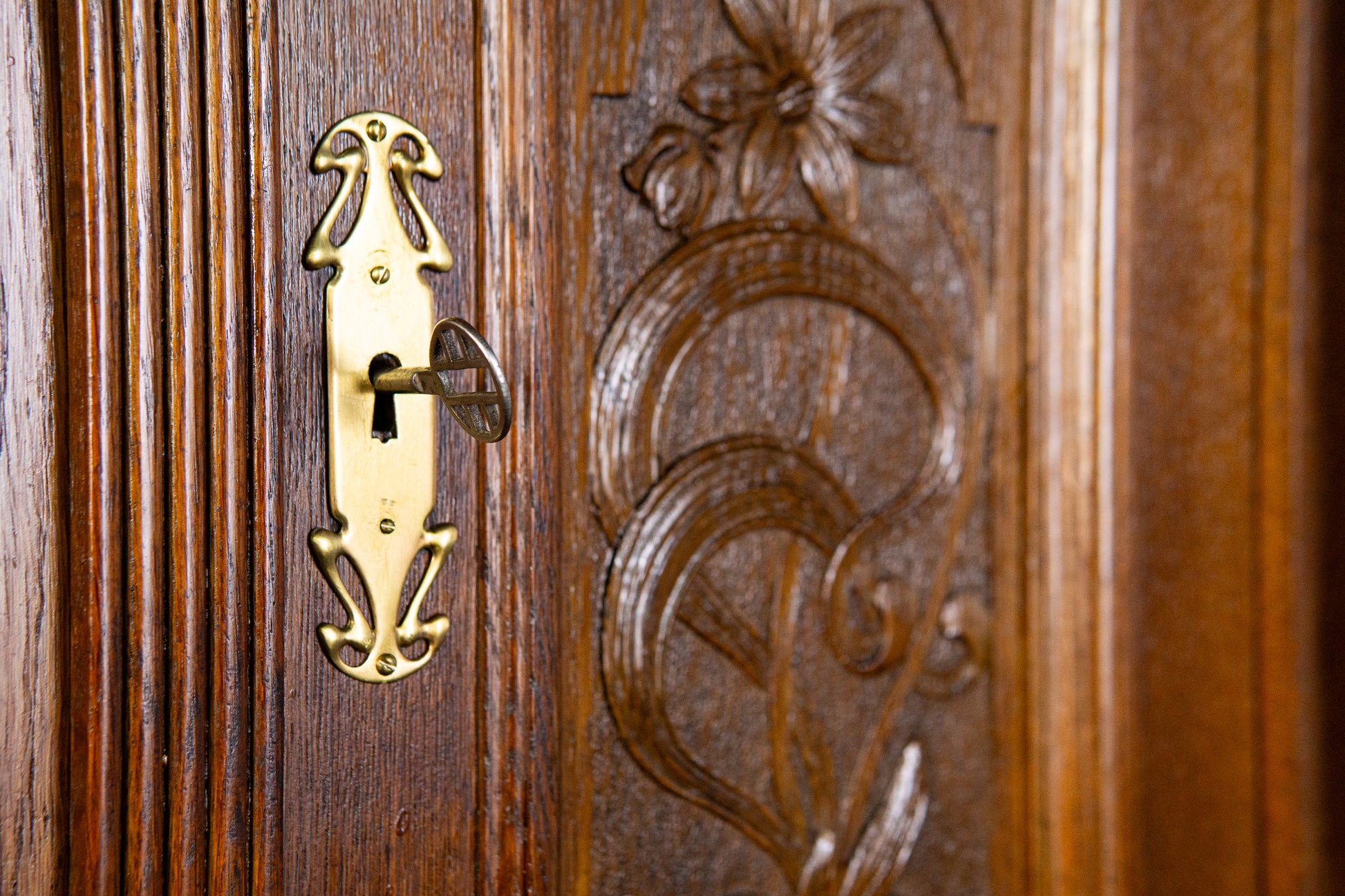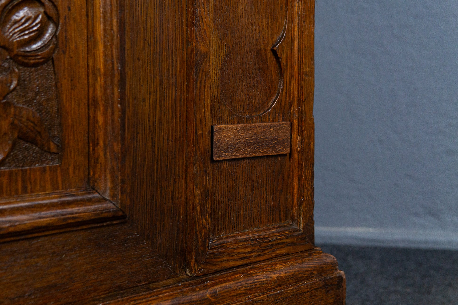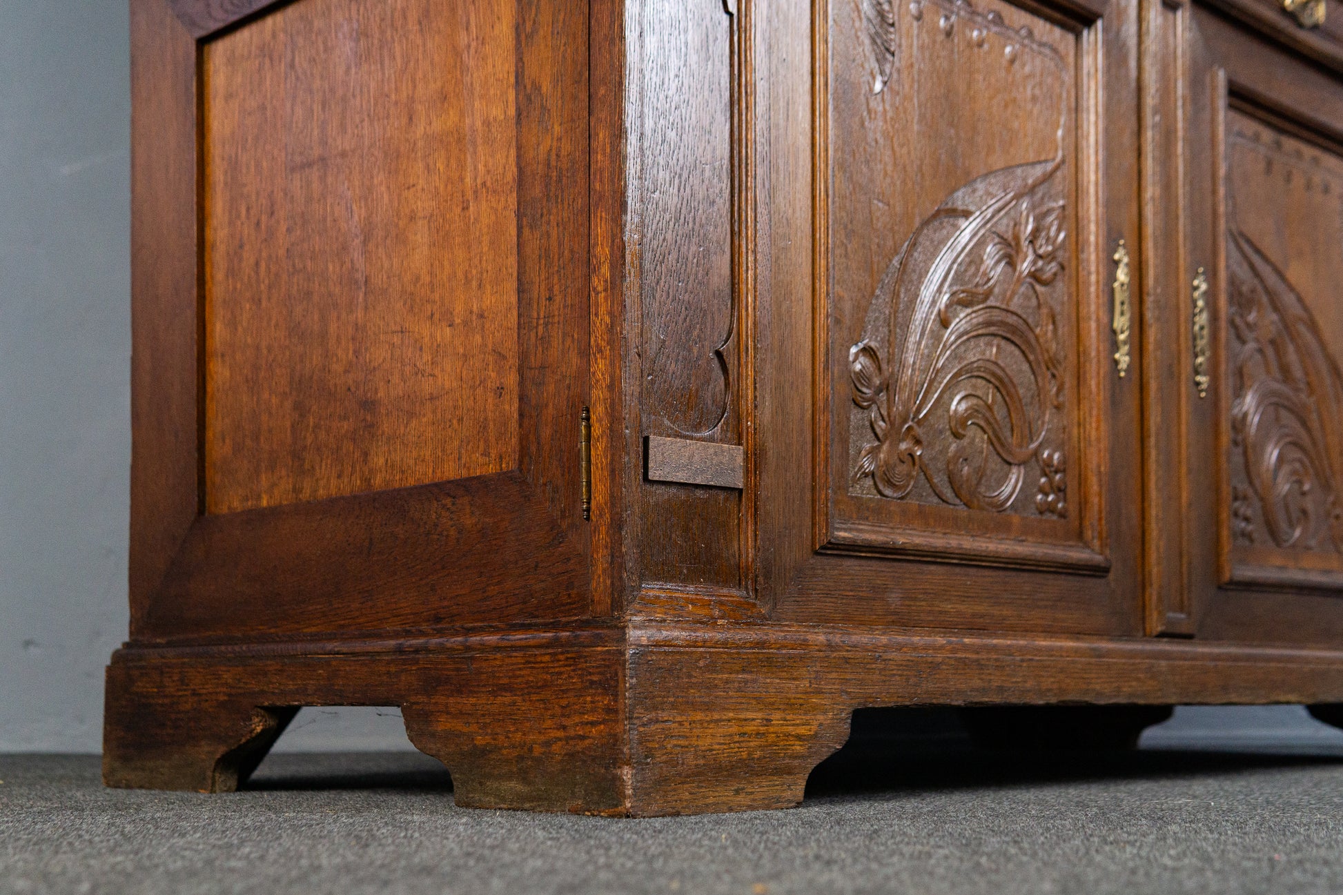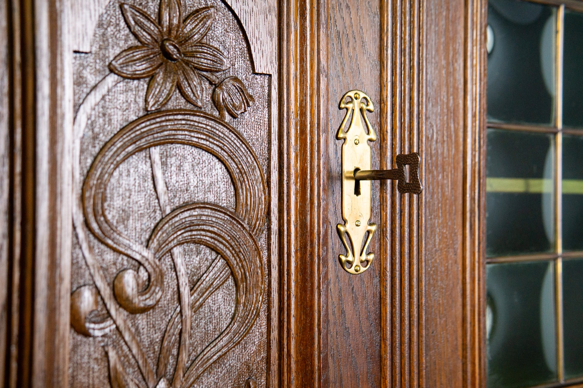 Dieses dekorative Aufsatzbuffet aus der Jugendstilzeit um 1900 vereint ästhetische Eleganz mit praktischer Funktionalität. Gefertigt in Vollholzkonstruktion mit Eichefurnier und teils massiven Elementen, überzeugt es durch detailreiche Handwerkskunst und durchdachten Innenausbau: Fachböden im Ober- und Unterteil, leichtlaufende Schubkästen sowie eine herausziehbare Ablage bieten großzügigen Stauraum. Originale Messingbeschläge, drei abschließbare Türen mit Schlüsseln sowie die Möglichkeit zur Zerlegung in zwei Teile machen dieses Buffet zu einem stilvollen und zugleich alltagstauglichen Möbelstück. In gutem, authentischem Zustand – ein langlebiges, nachhaltiges Original aus dem frühen 20. Jahrhundert.