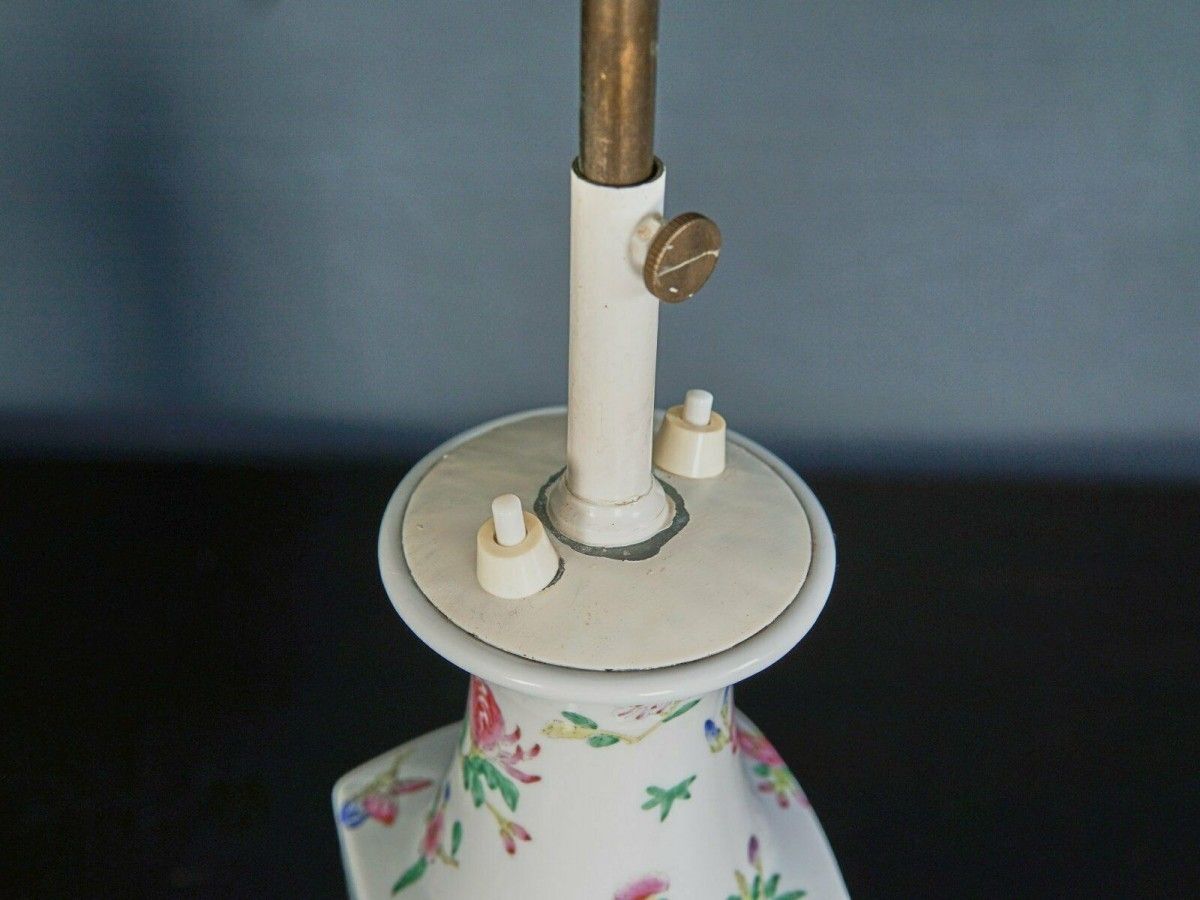 Objekt: Paar bemalte Porzellan Tischlampen mit Pagodenschirmen