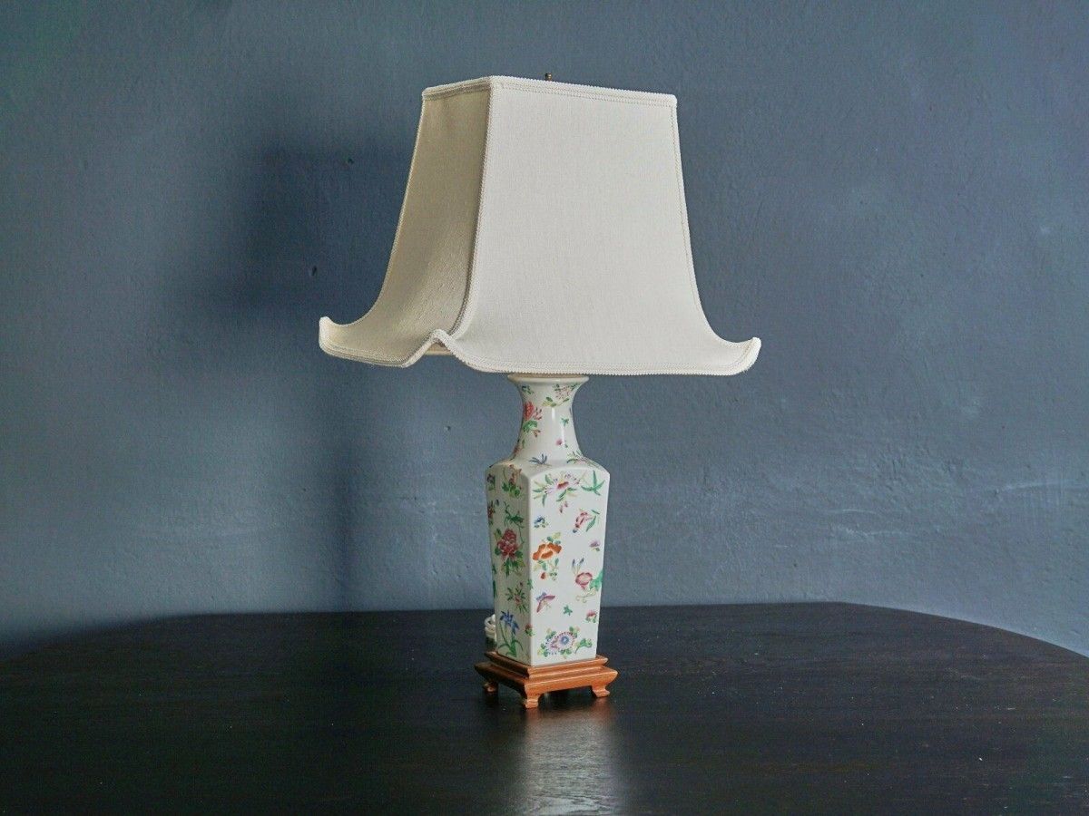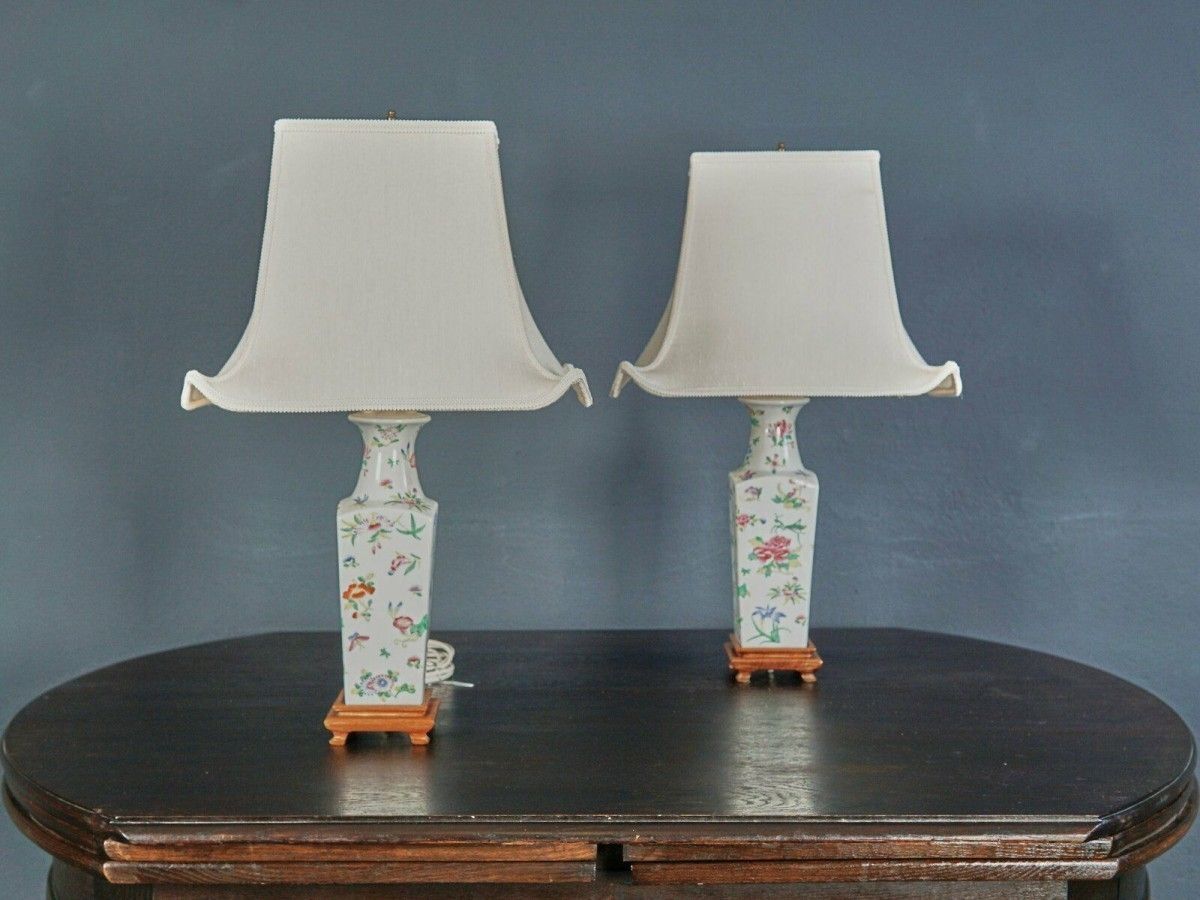 Ansehnliches Paar bemalter Porzellan Tischlampen mit rechteckigem Pagodenschirm. Der Porzellanfuß in Vasenform ist mit einer asiatischen floralen Malerei unter einer Glasur verziert. Die stoffbezogenen Leuchtschirme runden das stiltypische Gesamtbild des Interieurs wunderbar ab.