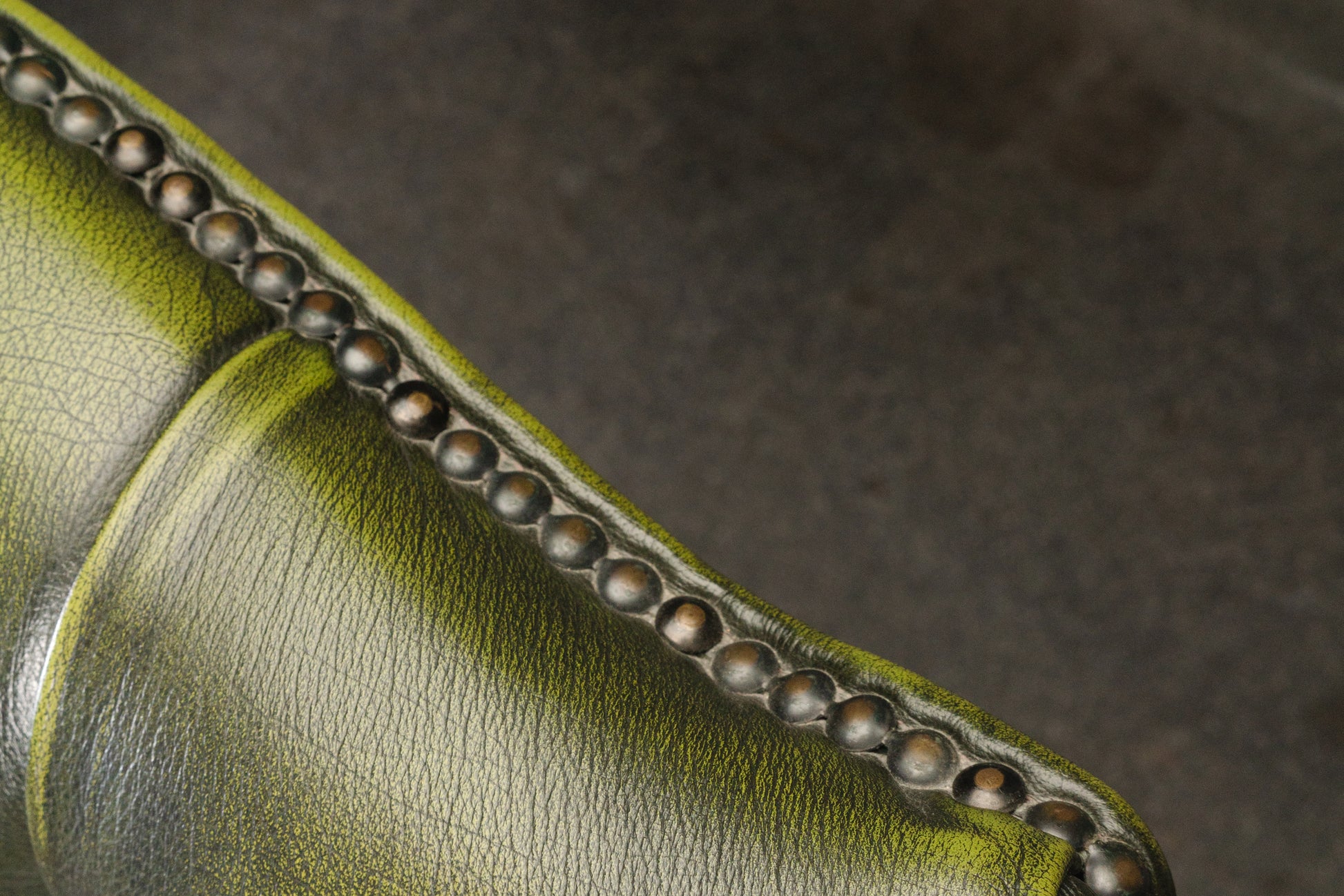 - Bezug: Grün patiniertes Lederimitat mit Knopfheftung