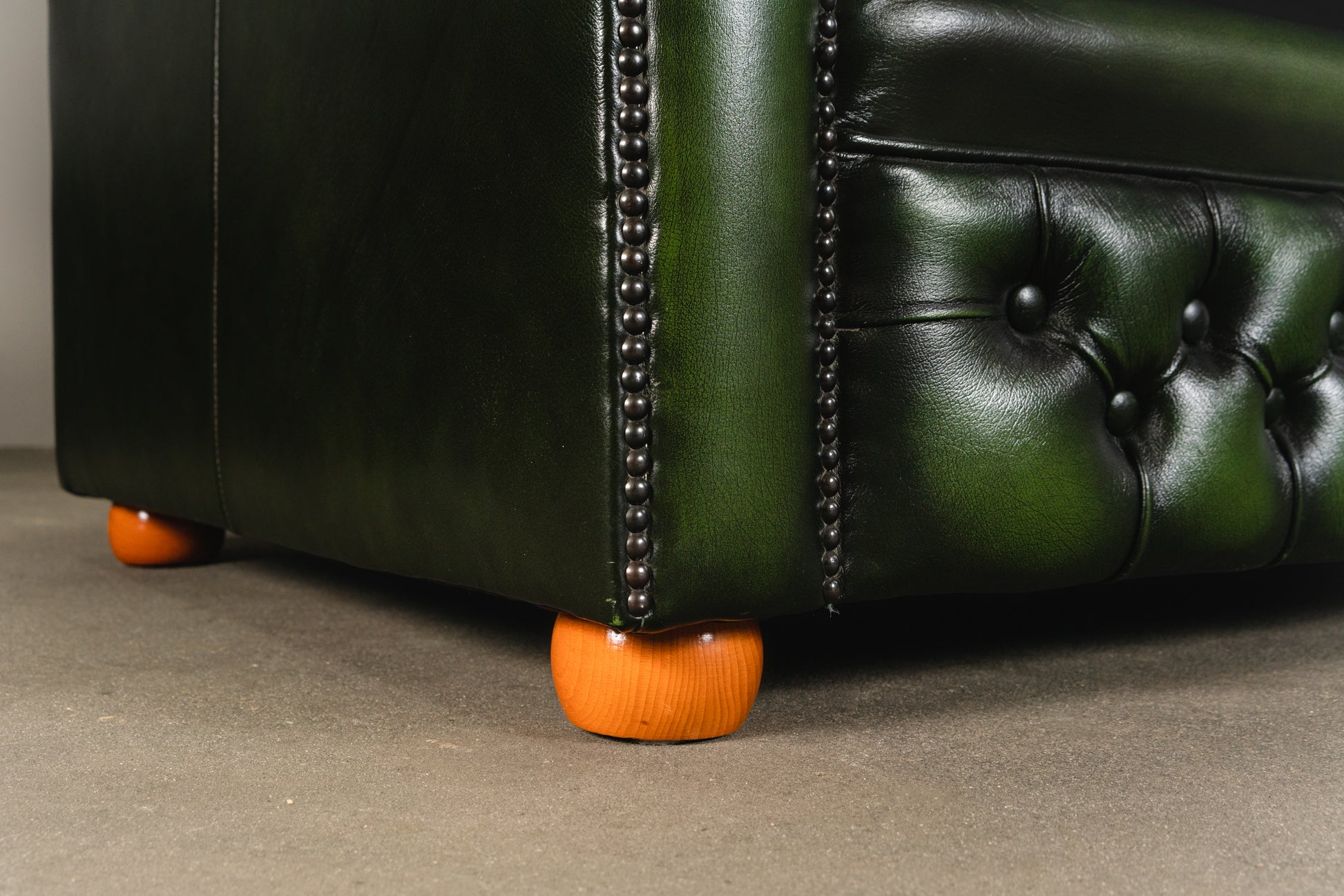 :: der sattgrüne Lederbezug in Vintage-Optik kombiniert mit warmen Massivholz-Elementen macht dieses Sofa zu einem hochwertigen Blickfang in jedem Raum