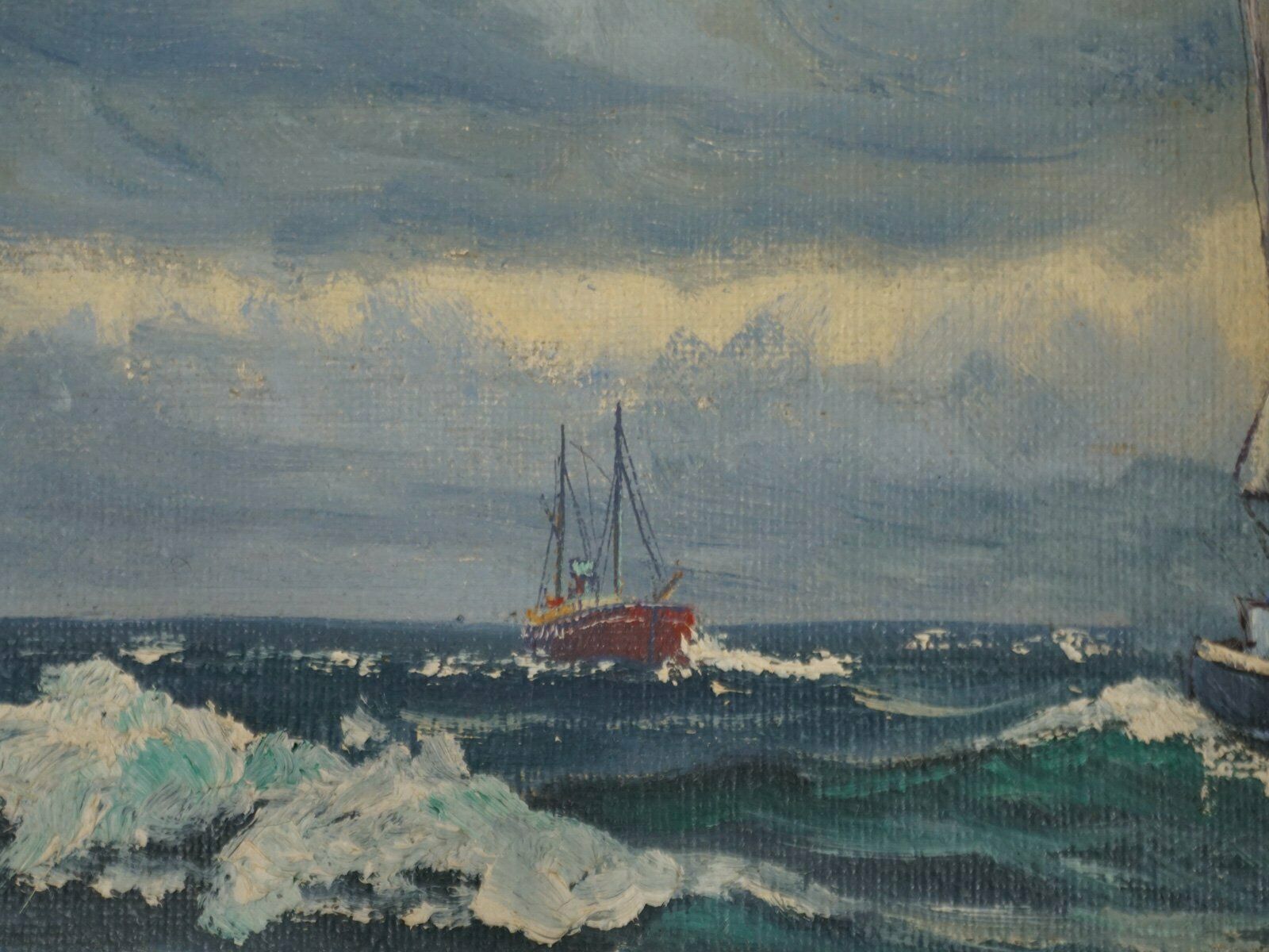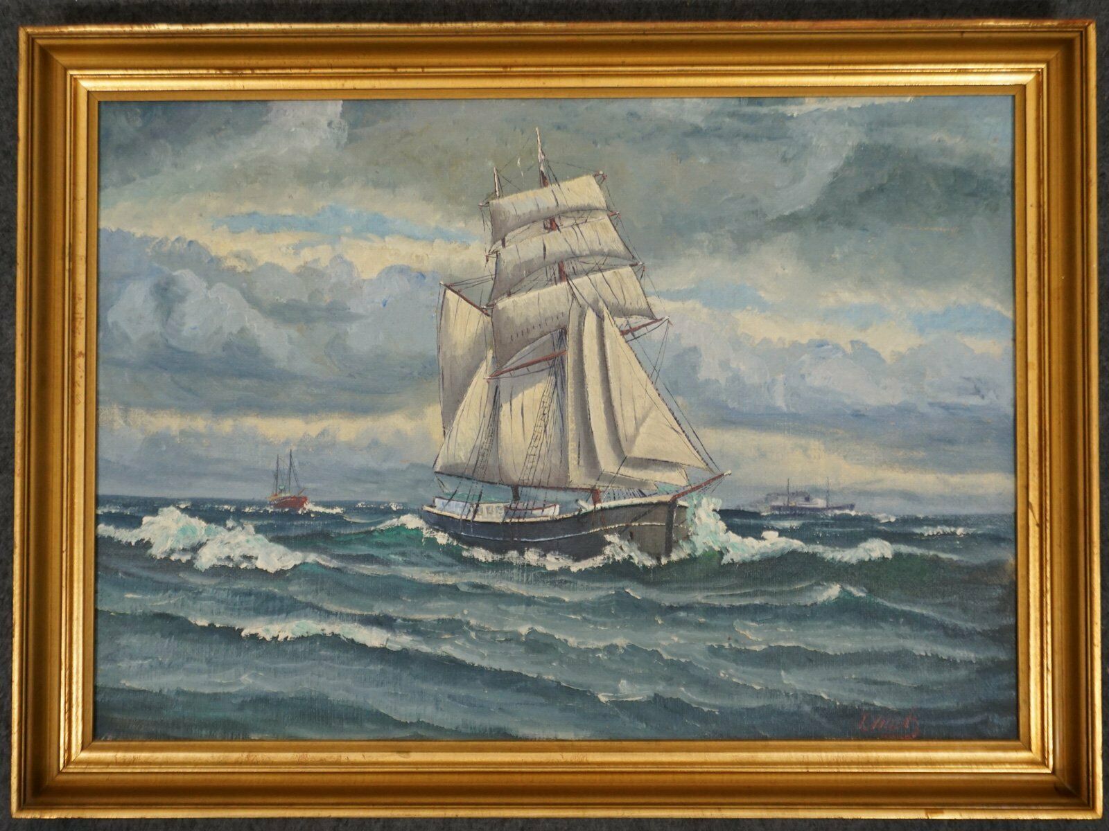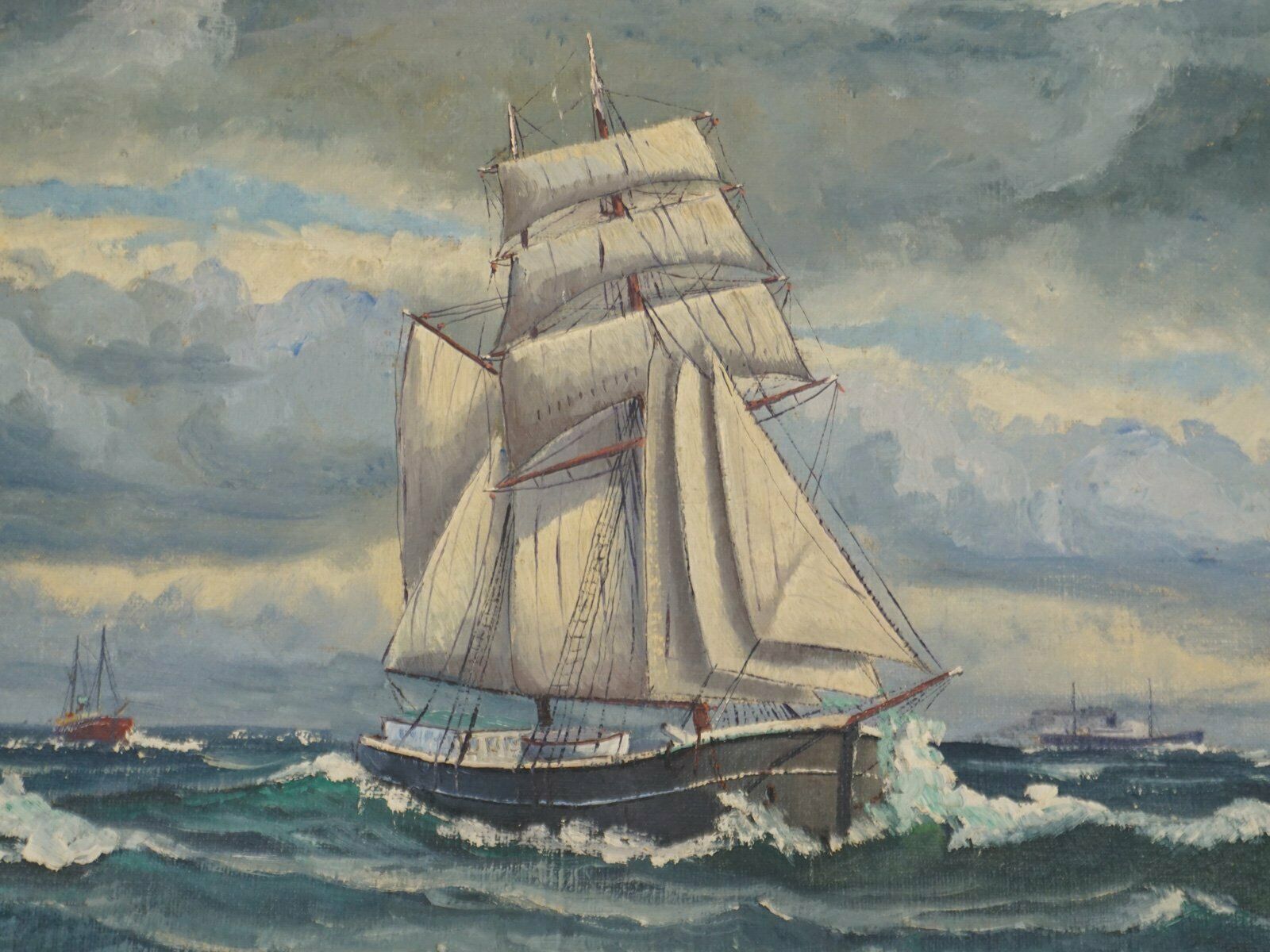 Feines Ölgemälde mit maritimer Darstellung von einem Zweimaster bei Windstärke 7 im vergoldeten Rahmen. Im Hintergrund ein Dampfer und ein Kutter. Wunderbare Wellen- und Wolkendarstellung. Signiert.