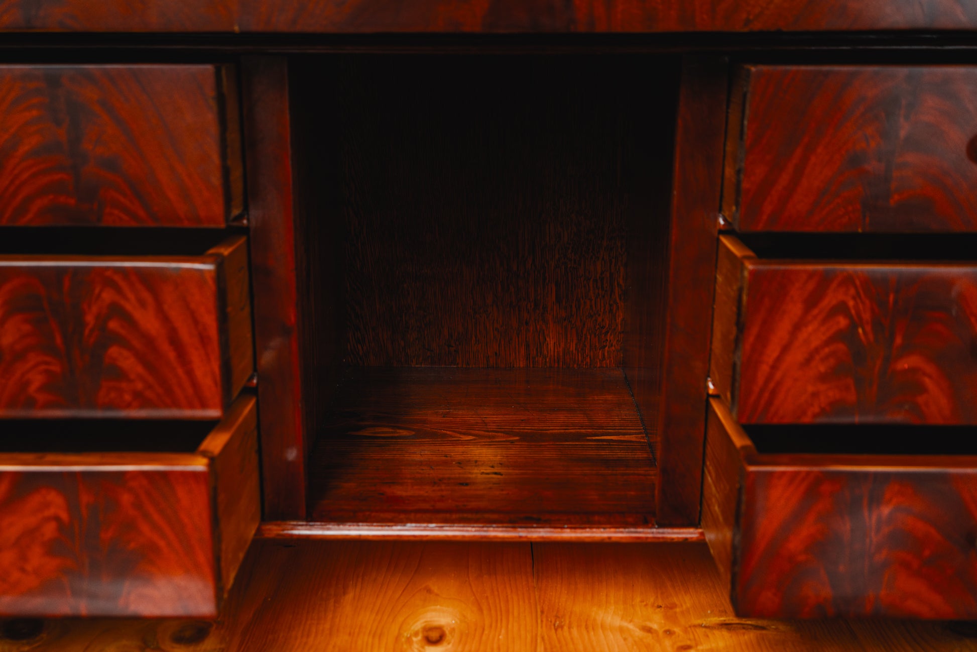 - tolle Inneneinteilung mit vielen kleinen Schubkästen und offenem Fach, in Mahagoni furniert