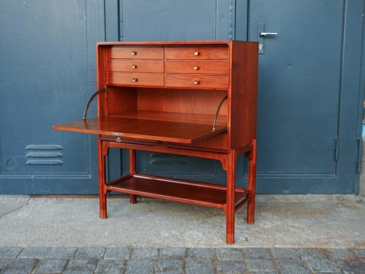 Interessant aufgeteilter Sekretär in Teak (teils furniert, teils massiv). Aufsatz mit Sekretärklappe und zwei Schubladen auf stabilem Untergestell mit seitlich herrausziehbarer Ablage. Die Klappe öffnet mittels einer feinen Mechanik aus Messing, dahinter befinden sich sechs gleich große Schubladen und eine große Ablage bzw. Schreibplattenerweiterung. Kaum sichtbar ist eine Lampe in der rechten oberen Ecke der inneren Ablage verbaut.