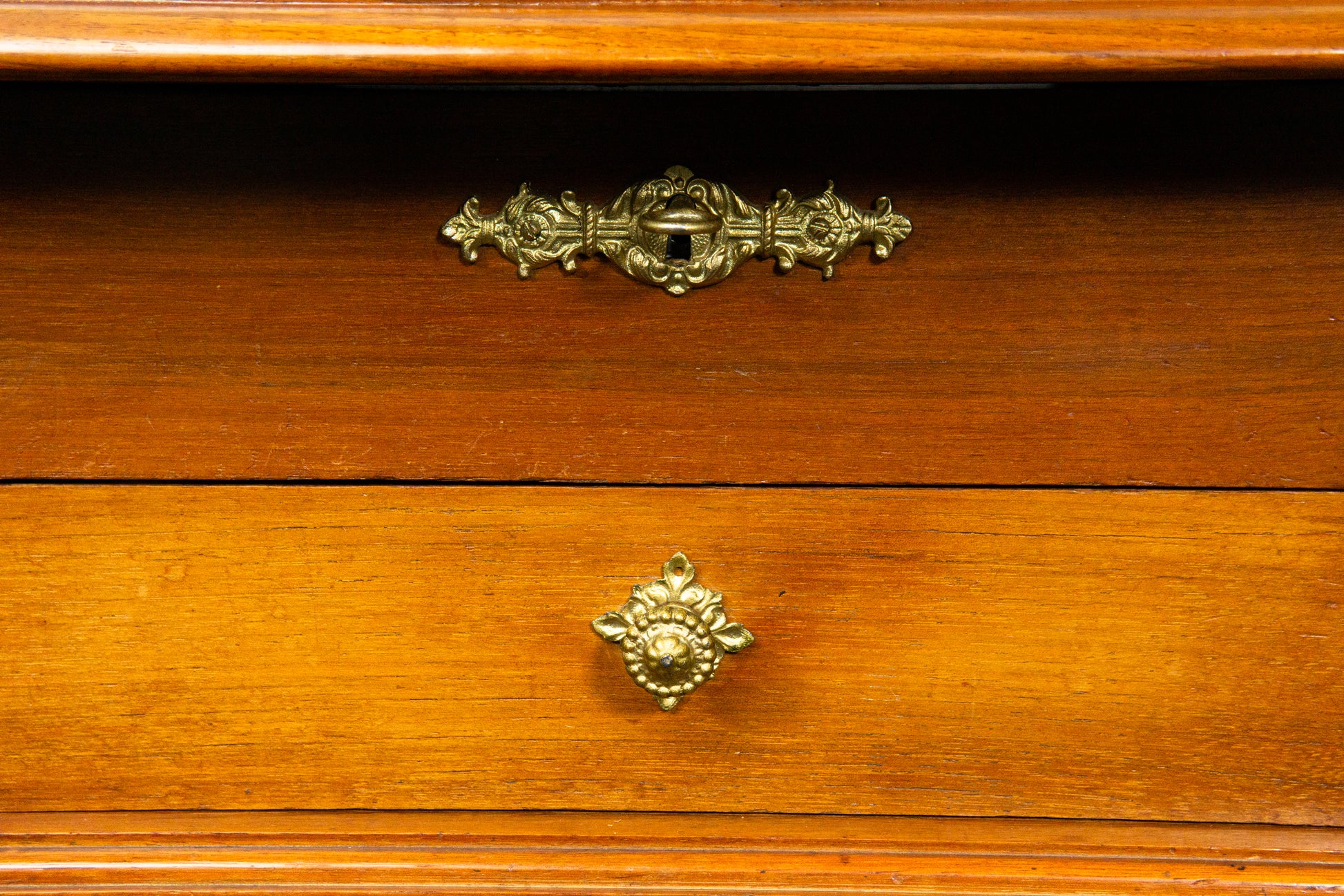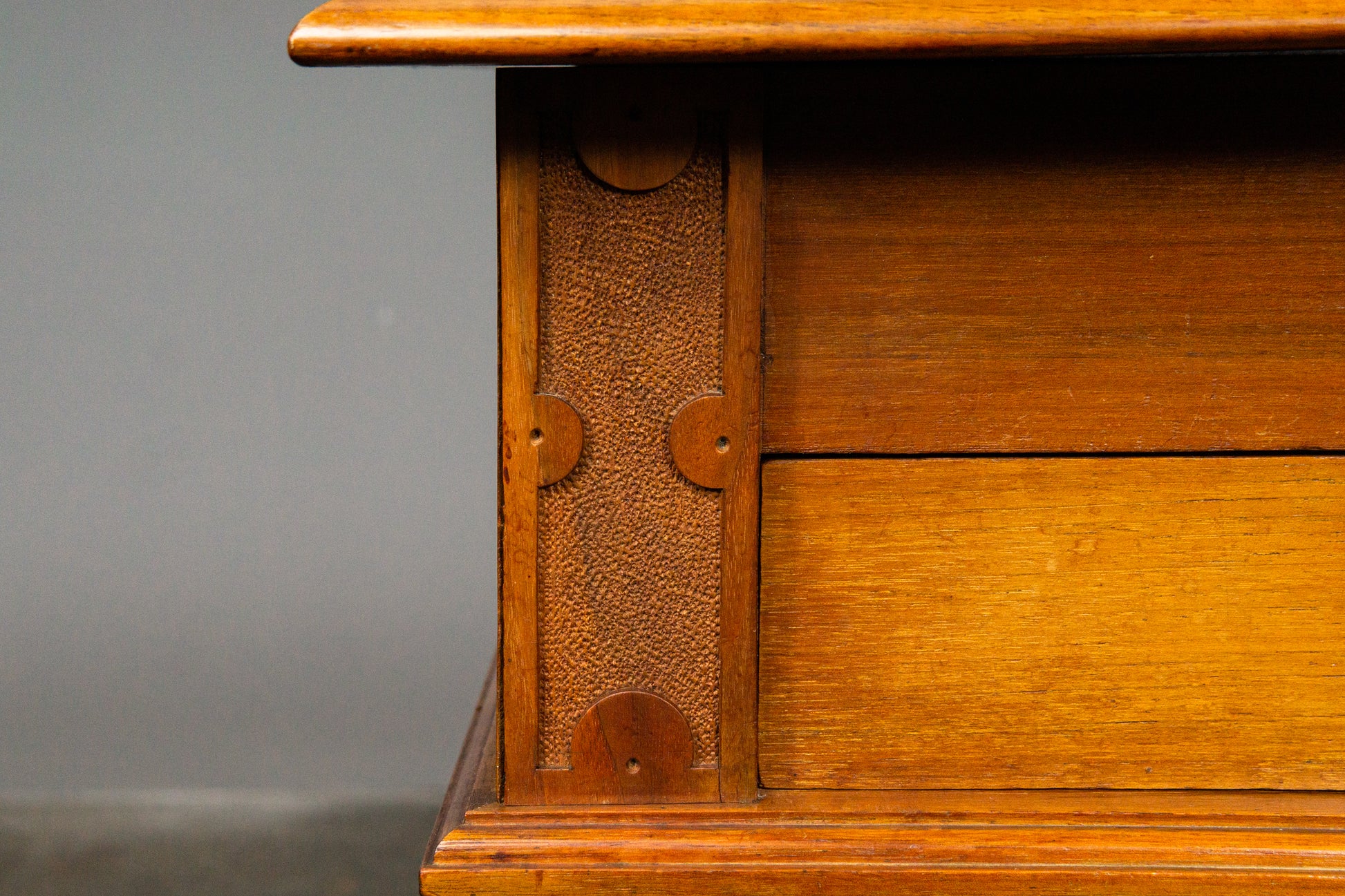 ⁃ Vollholzkonstruktion in Nussbaum furniert und massiv gefertigt, Deckplatte in weiteren Harthölzern furniert