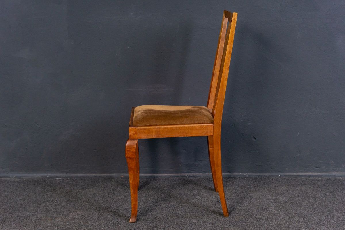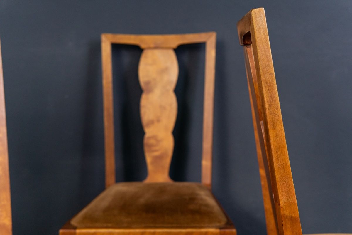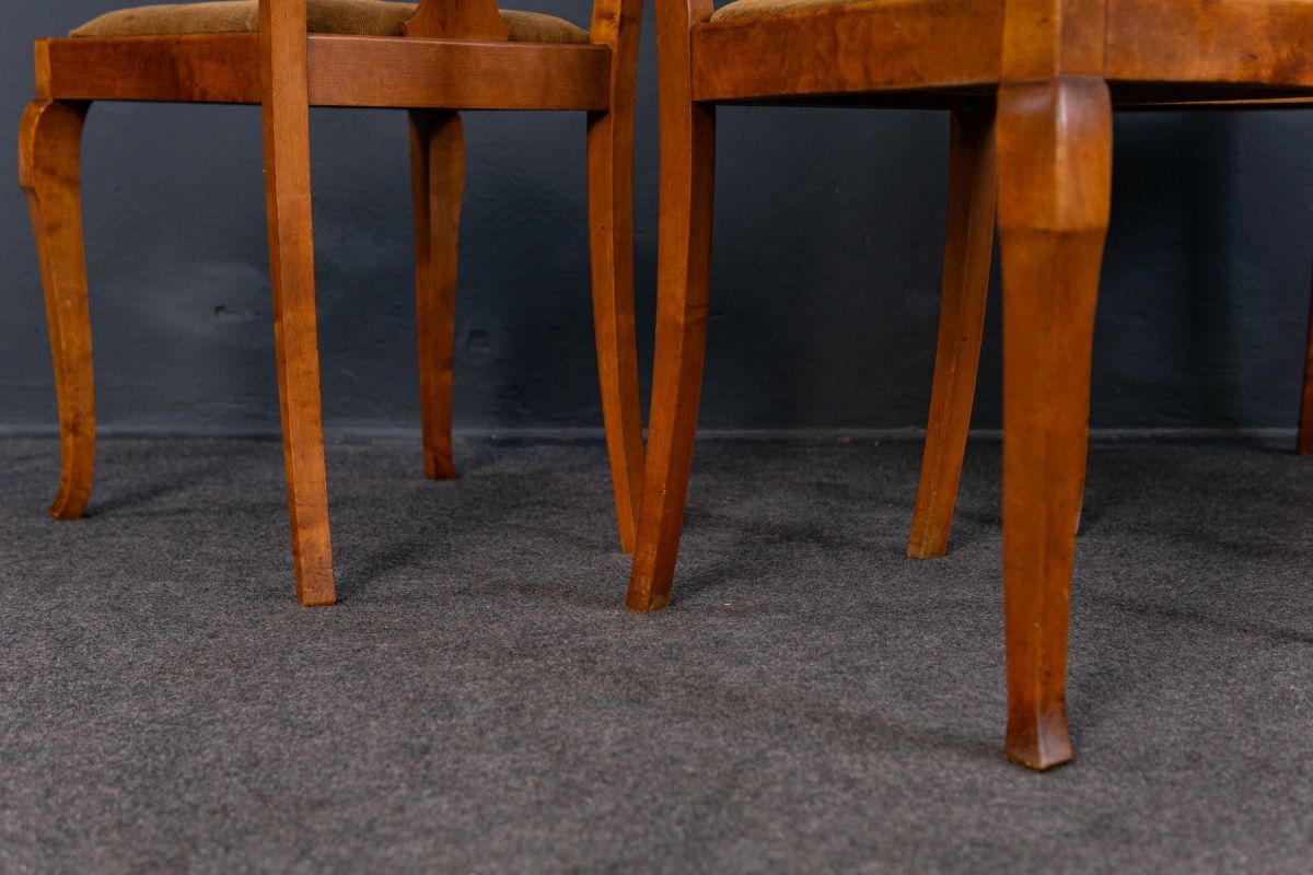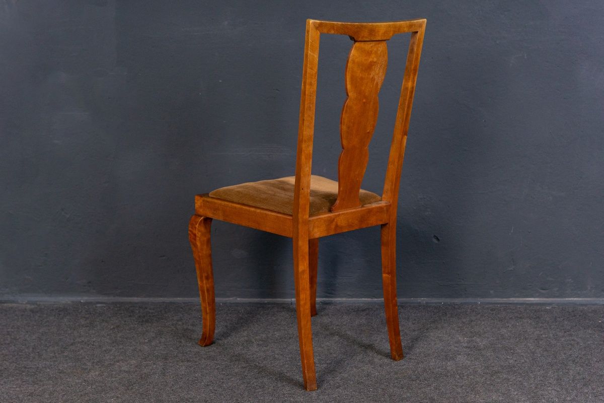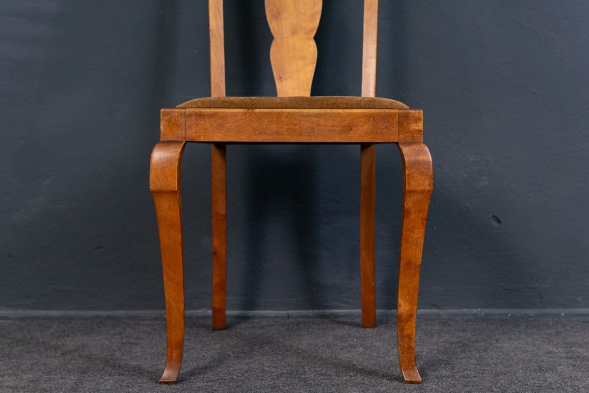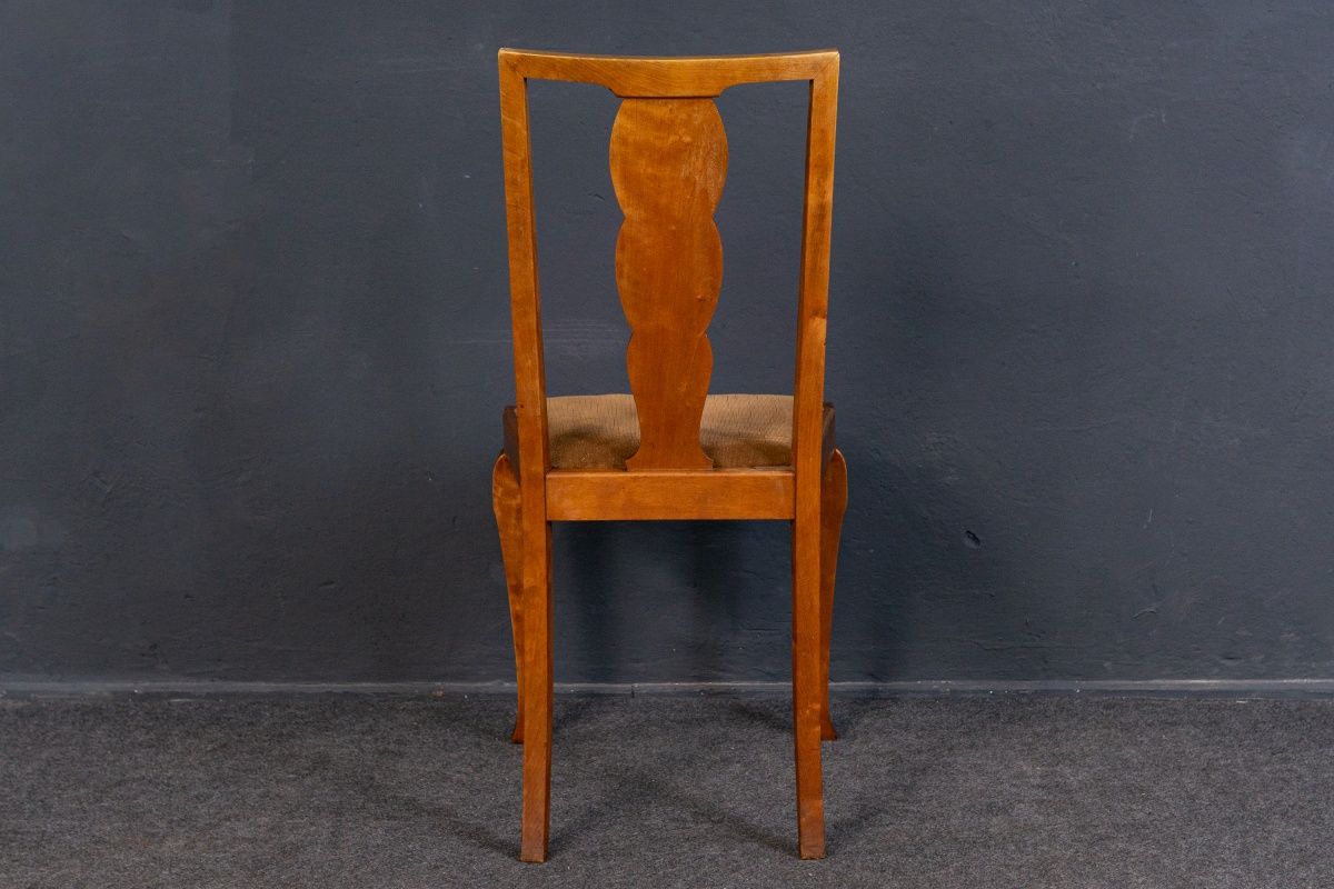 Die Stühle befinden sich in einem aufarbeitungswürdigen Zustand mit altersbedingten Gebrauchsspuren. Die Sitzpolster müssten erneuert und die Stuhlkonstruktion verleimt werden.