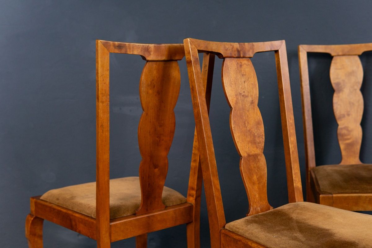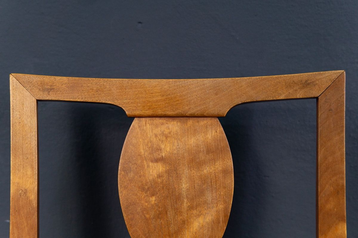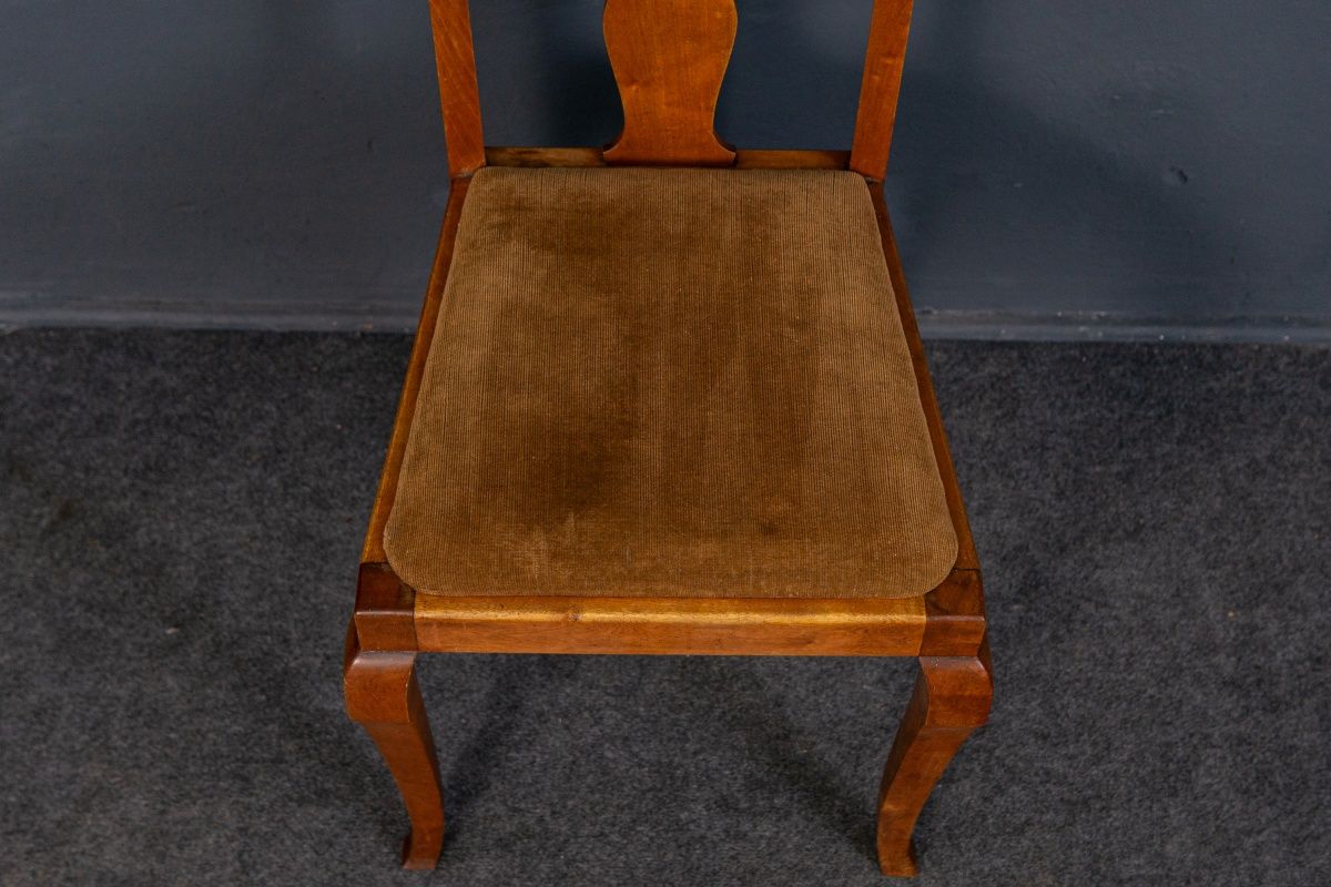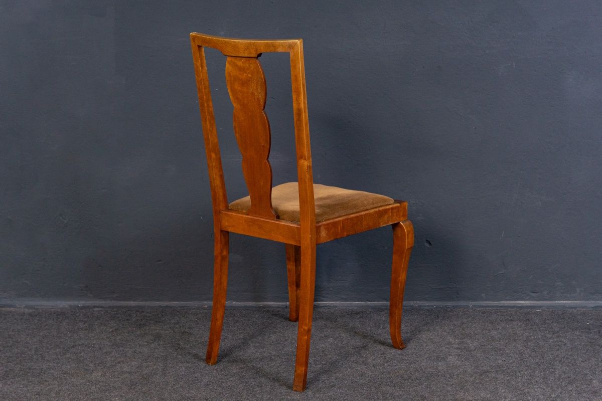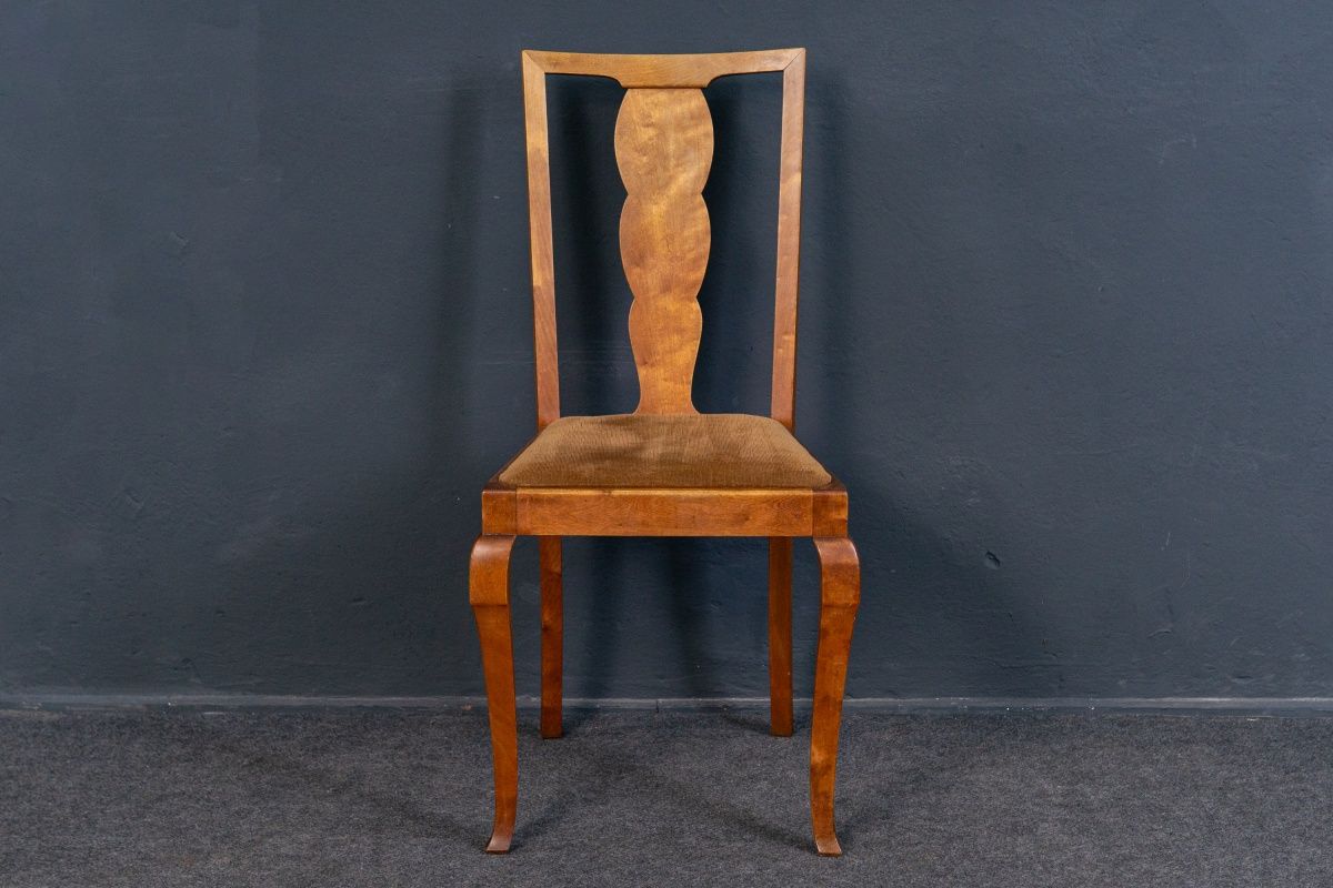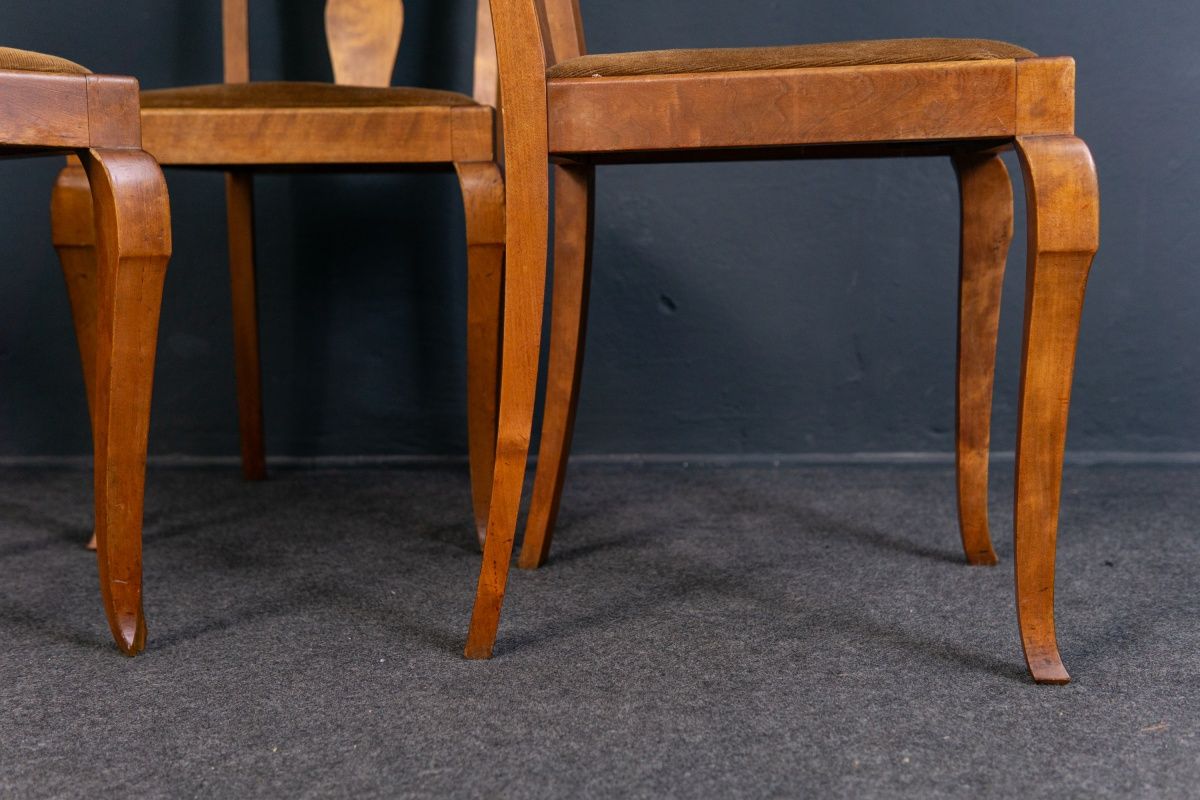 Die Stühle befinden sich in einem aufarbeitungswürdigen Zustand mit altersbedingten Gebrauchsspuren. Die Sitzpolster müssten erneuert und die Stuhlkonstruktion verleimt werden.