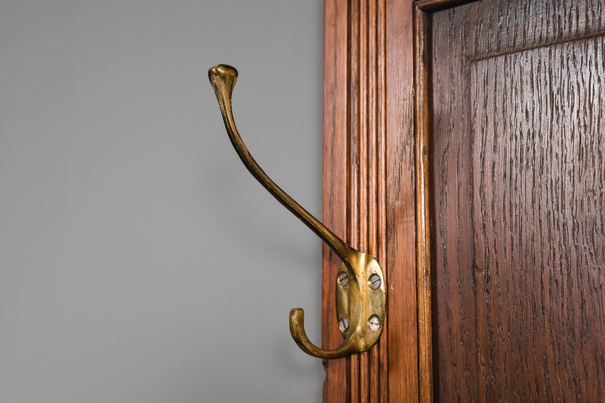 Das Möbel befindet sich in einem guten gepflegten und funktionsfähigem Zustand mit authentischem Erscheinungsbild und altersbedingten Gebrauchsspuren. Der abgebrochene Teil des linken Kleiderhakens ist noch vorhanden.