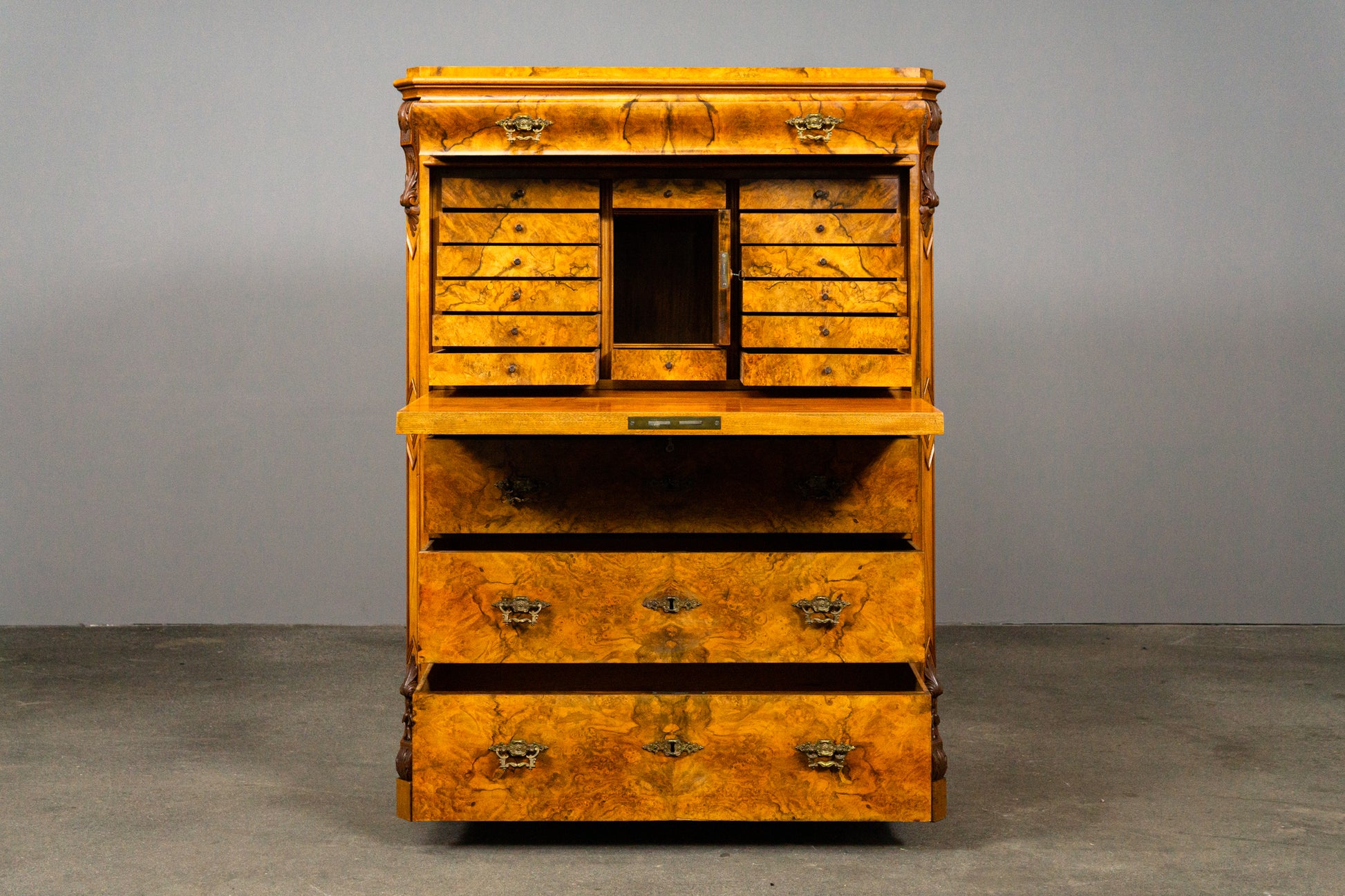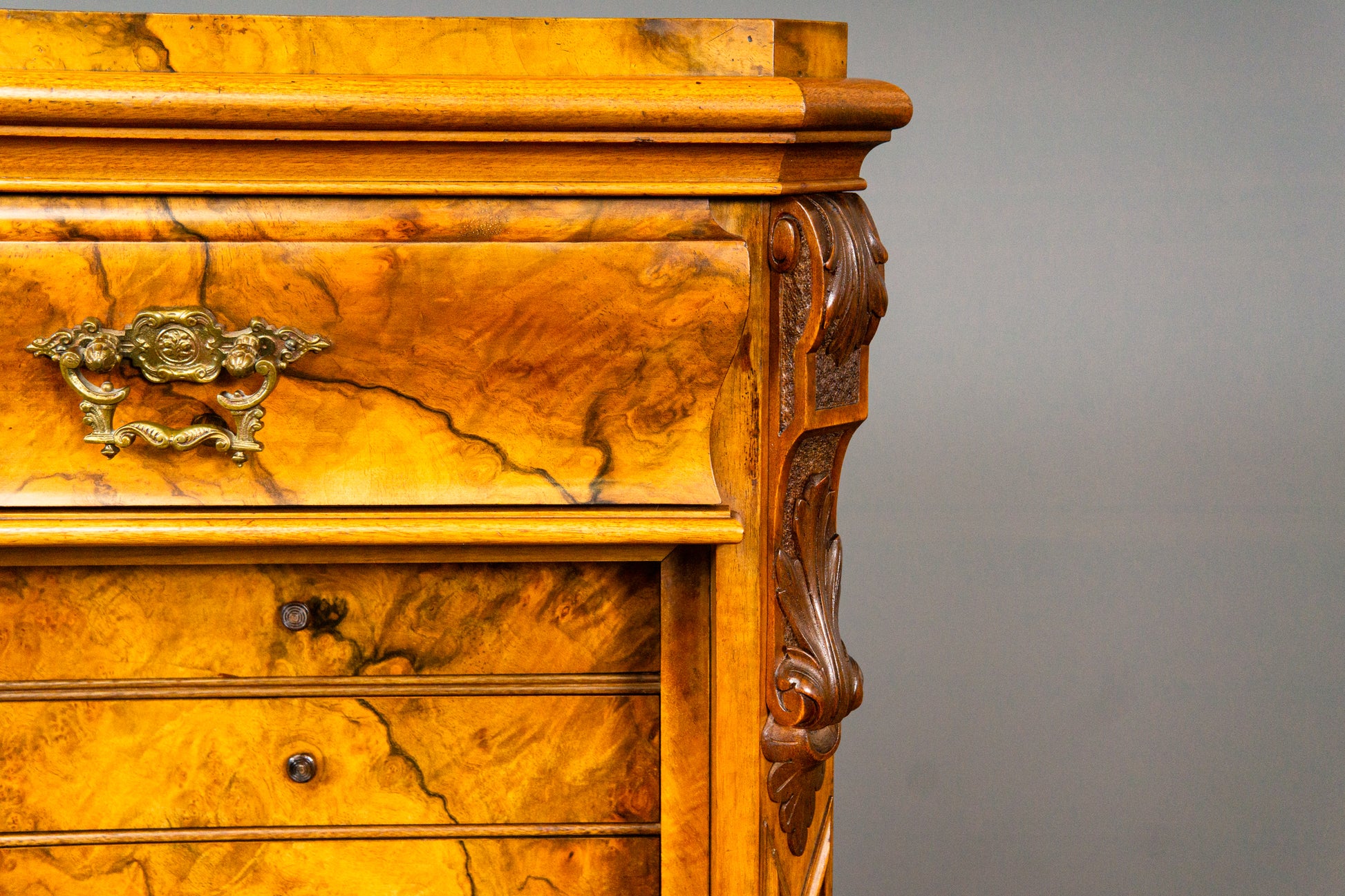 - detailreiche Schnitzereien aus massivem Nussbaum